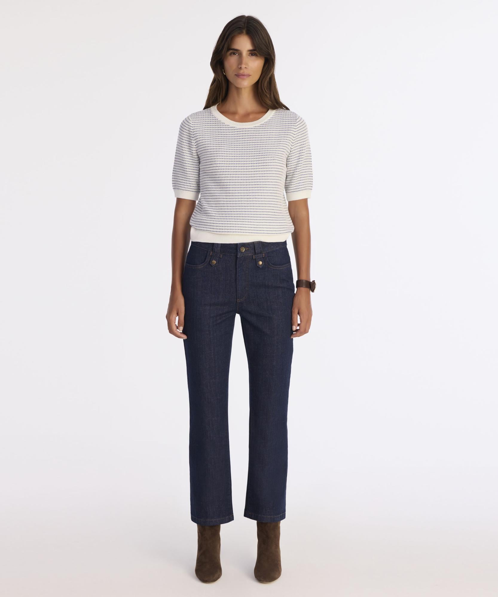 Yatay mini desenleri ve kısa kol yapısıyla öne çıkan bu triko, sade çizgilerle modern bir görünüm sunuyor. Yumuşak dokusu sayesinde cilt dostu bir konfor sağlarken, klasik ve rahat kesimiyle günlük kullanım için idealdir. Kış aylarında oversize hırkalar veya kalın örgü yeleklerle katmanlı şekilde kombinlenerek stilinizi tamamlayabilirsiniz. Geniş paça pantolonlarla birlikte hem şık hem konforlu bir bütünlük oluşturur.