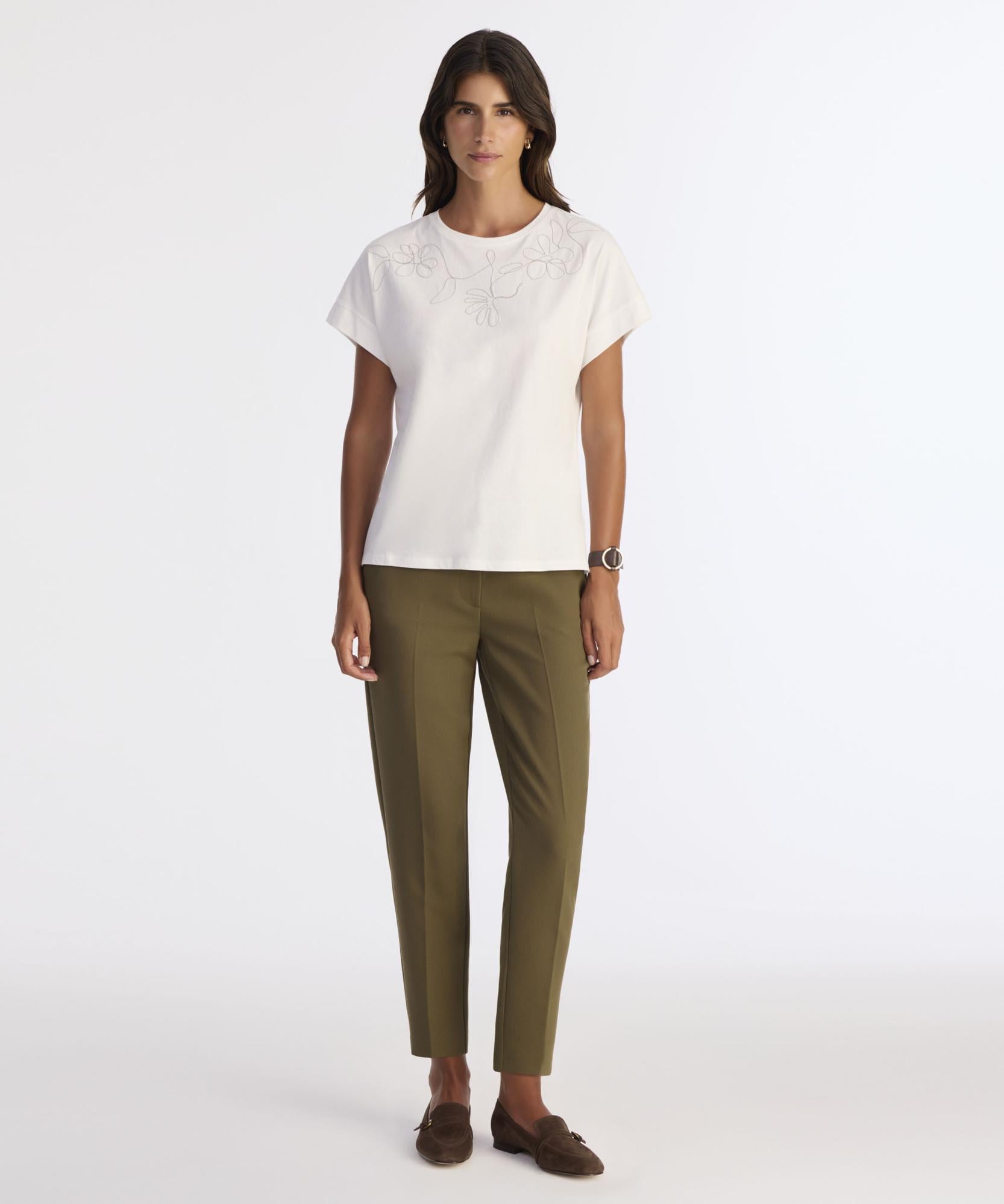 Yaka kısmında floral desenli minimal nakış detaylarıyla öne çıkan bu tişört, sade tarzı zarif bir dokunuşla buluşturuyor. Günlük kullanım için konforlu yapısıyla ideal bir seçenek sunar. Hafif dökümlü kesimi sayesinde her bedene uyum sağlar. Kış sezonunda oversize hırka ve jogger pantolonla rahat ve modern bir kombin oluşturabilirsiniz.