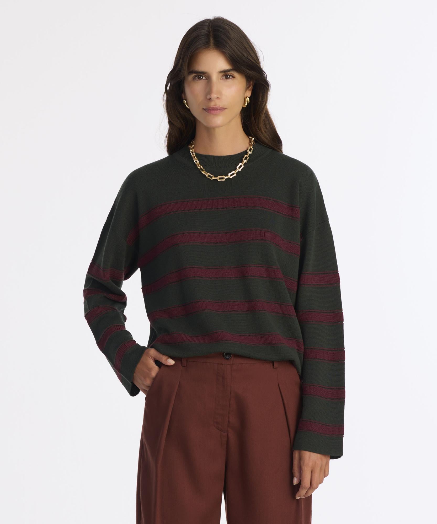 Yatay çizgili bu triko kazak, klasik ve sportif tarzı bir araya getirerek günlük kombinlerinizde şıklığı yakalamanıza yardımcı oluyor. Rahat kesimi sayesinde gün boyu konfor sunarken, desen detaylarıyla hareketli bir görünüm sağlıyor. Kış mevsiminde jean pantolon ve kısa botlarla tamamlayabileceğiniz modern bir stil sunar. Soğuk günlerde içine gömlek giyerek katmanlı bir görünüm de elde edebilirsiniz.