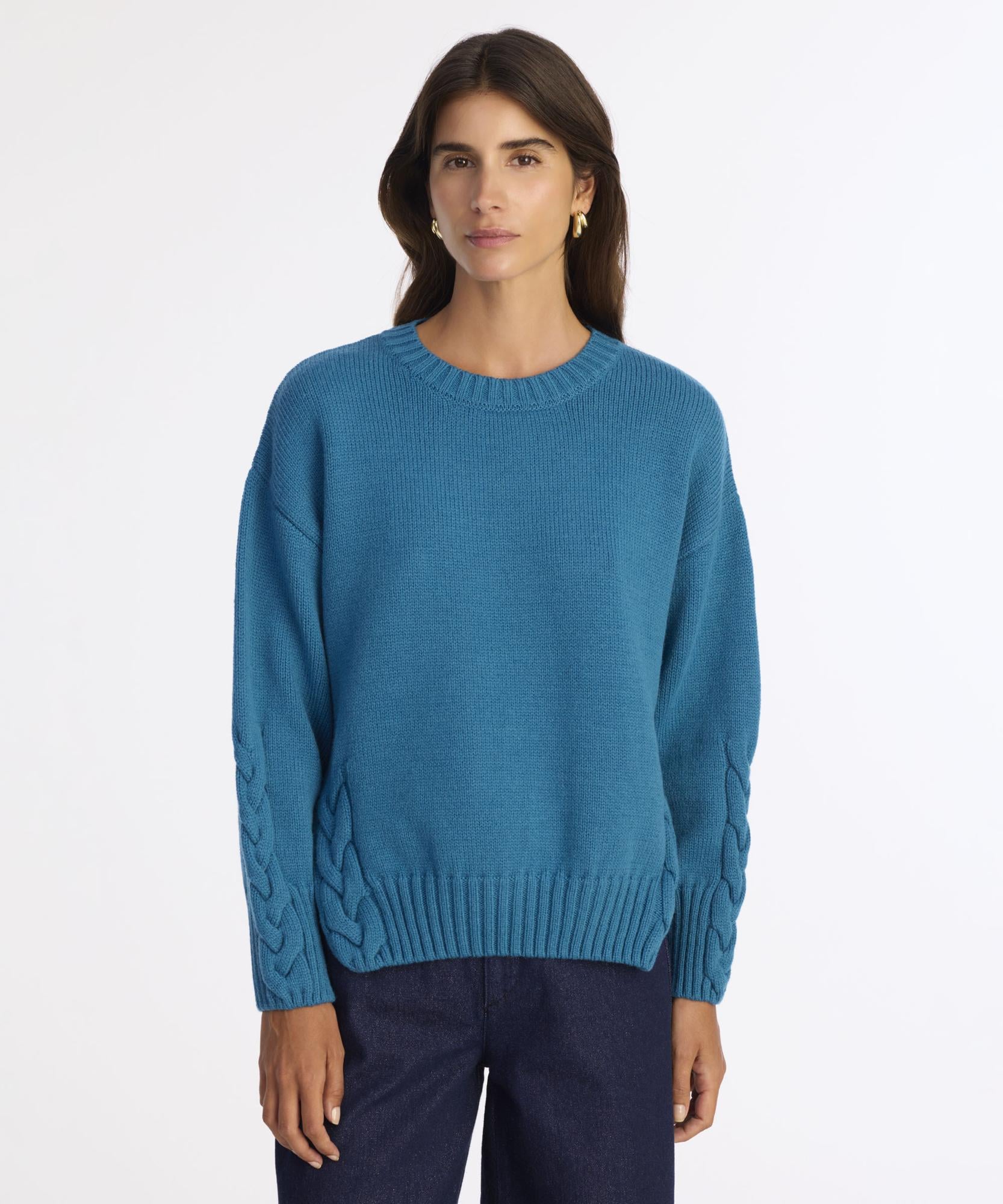 Zarif örme detayları ve yuvarlak yaka kesimiyle öne çıkan bu triko kazak, sade tarzıyla dikkat çekiyor. Yanlardaki örgü desenleri, modele hoş bir dokunuş katarken konforlu kalıbı kış boyunca sıcaklık sağlıyor. Bol paça pantolonlar ve kısa topuklu botlarla şık bir kış kombini oluşturabilirsiniz. Günlük kullanımda ve ofis stilinde rahatlıkla tercih edilebilecek zamansız bir parça olarak gardırobunuzda yer alabilir.