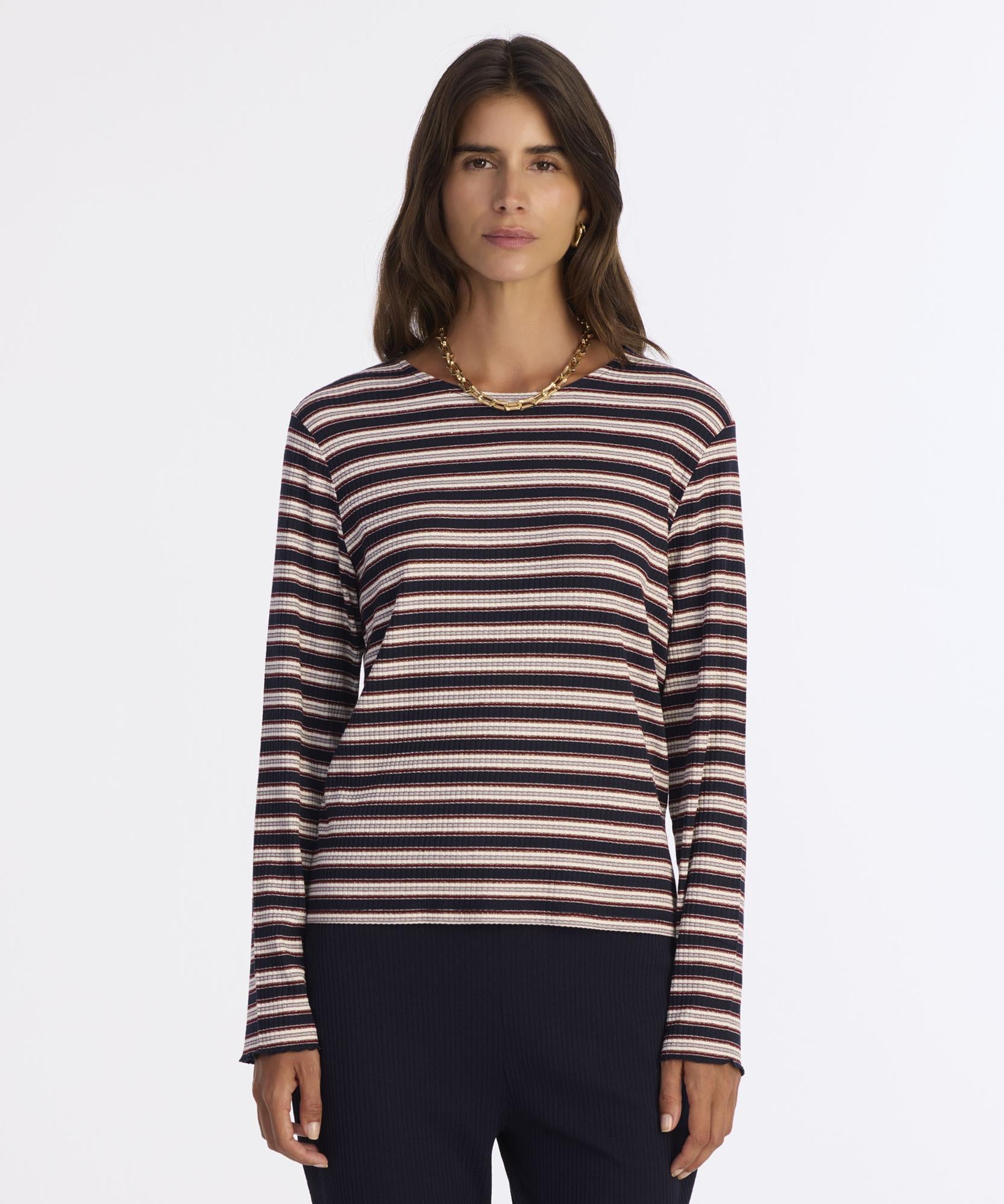 Modern çizgili deseniyle dikkat çeken bu uzun kollu tişört, günlük kombinlere hareket katmak isteyenler için zarif bir seçenek sunuyor. Yumuşak dokusu ve esnek yapısı sayesinde gün boyu konfor sağlıyor. Kol uçlarındaki hafif büzgülü detaylar, ürüne şık bir dokunuş katıyor. Kış aylarında yüksek bel mom jean ve kısa montlarla rahatlıkla kombinlenebilir.
