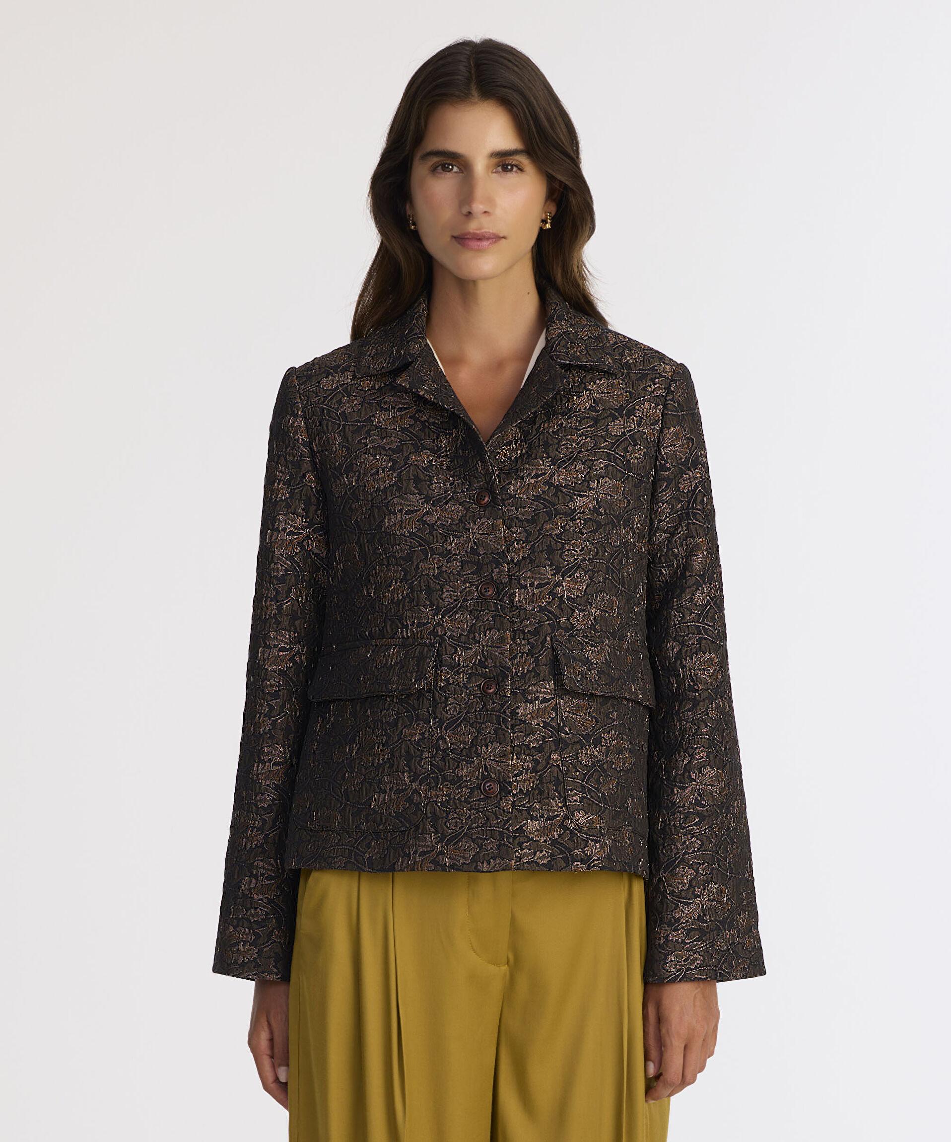 Şık dokusu ve özel desenleriyle dikkat çeken bu ceket, zarif ve sofistike bir görünüm sunuyor. Ön kısmındaki düğme detayları ve klasik yakası ile stilinizi tamamlamak için harika bir parça haline geliyor. Soğuk havalarda şık kalmak isteyenler için oldukça uygun bir tercihtir. Kış aylarında yüksek bel kumaş pantolonlar ve botlarla zarif bir kombin oluşturabilirsiniz.