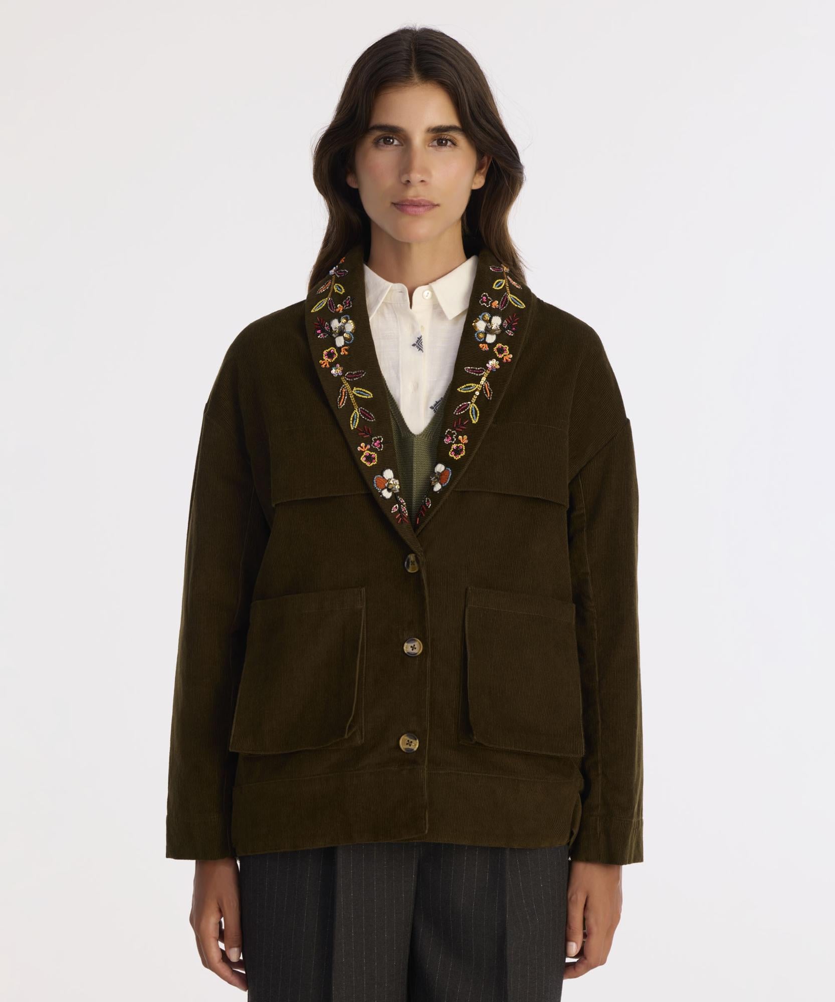 Kadife dokusu ve çiçek işlemeli yakasıyla öne çıkan bu ceket, nostaljik bir şıklık sunuyor. Büyük cepleri hem işlevsel hem de stil sahibi bir duruş katıyor. Kış kombinlerinizde bohem tarzı yakalamak için ideal bir parça. Kalın örgü kazaklar ve düz paça pantolonlarla harika bir uyum yakalayabilirsiniz.