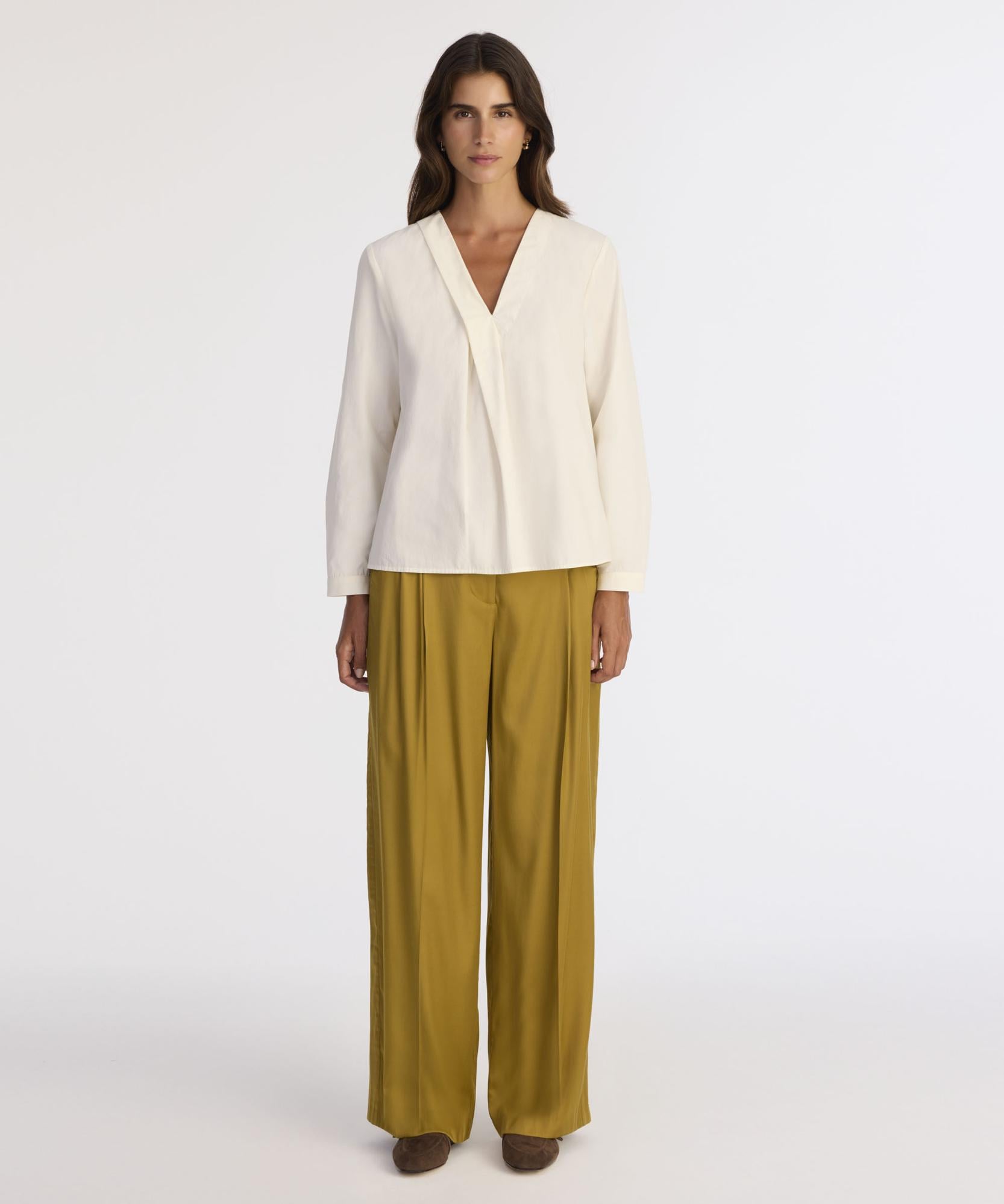 Şıklığı ve sadeliği bir araya getiren bu uzun kollu bluz, çapraz ön detayıyla modern bir duruş sergiliyor. Hafif yapısıyla gün boyu rahatlık sağlarken, V yaka tasarımı zarif bir görünüm katıyor. Kış aylarında kaşe kabanlar ve desenli eşarplarla kolayca kombinlenebilir. Yüksek bel pantolon veya eteklerle tamamlayarak günlük stilinize sofistike bir dokunuş ekleyebilirsiniz.