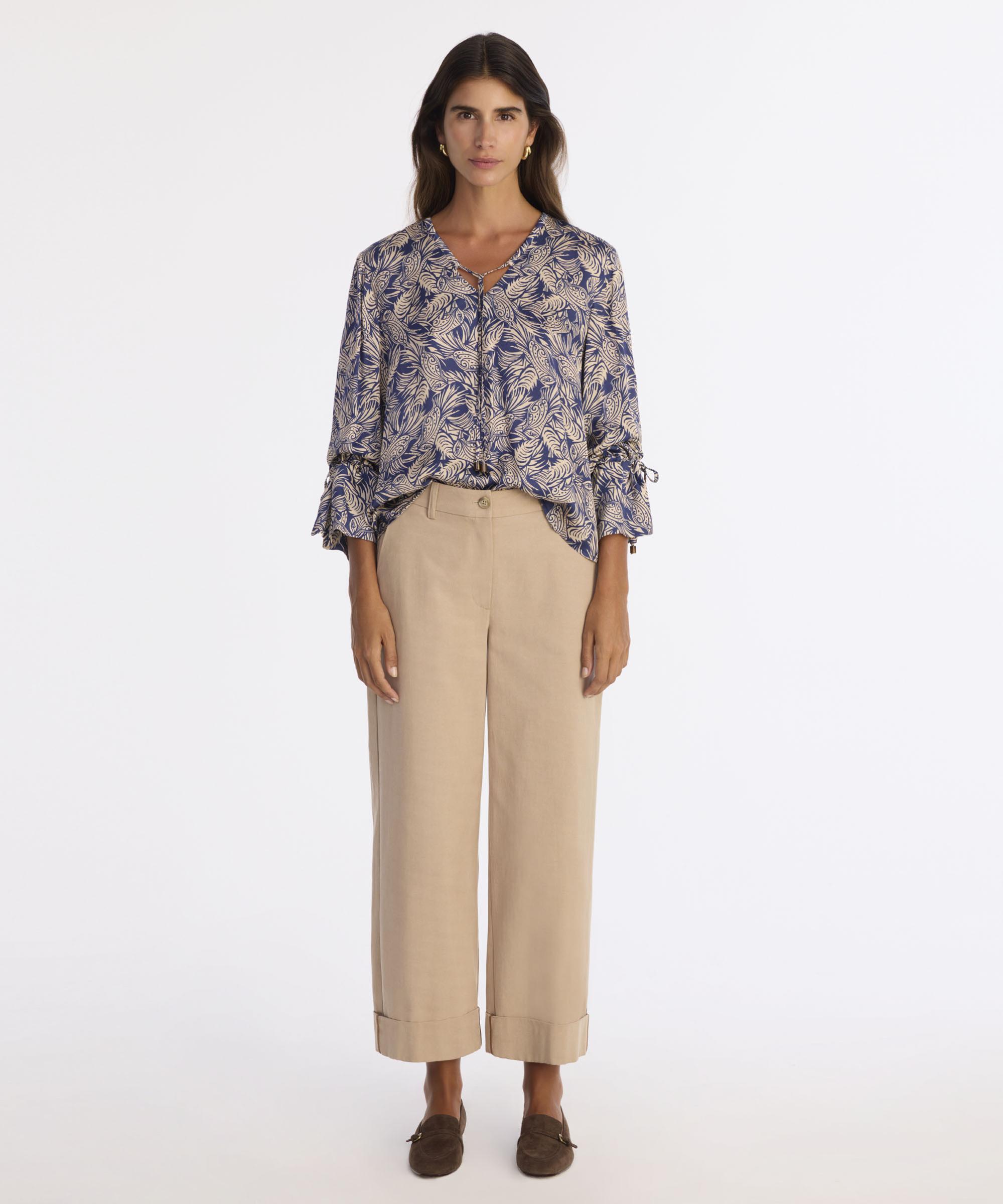 Doğadan ilham alan yaprak desenleriyle hareket kazanan bu bluz, bağlamalı yaka detayıyla zarif bir hava sunuyor. Rahat kesimi sayesinde gün boyu konfor sağlarken, bilek detayları stilinize şıklık katıyor. Kış sezonunda triko yelekler ve oversize kabanlarla hoş bir uyum yakalayabilir. Yüksek bel kadife pantolonlarla kombinleyerek sezonun ruhunu yansıtabilirsiniz.