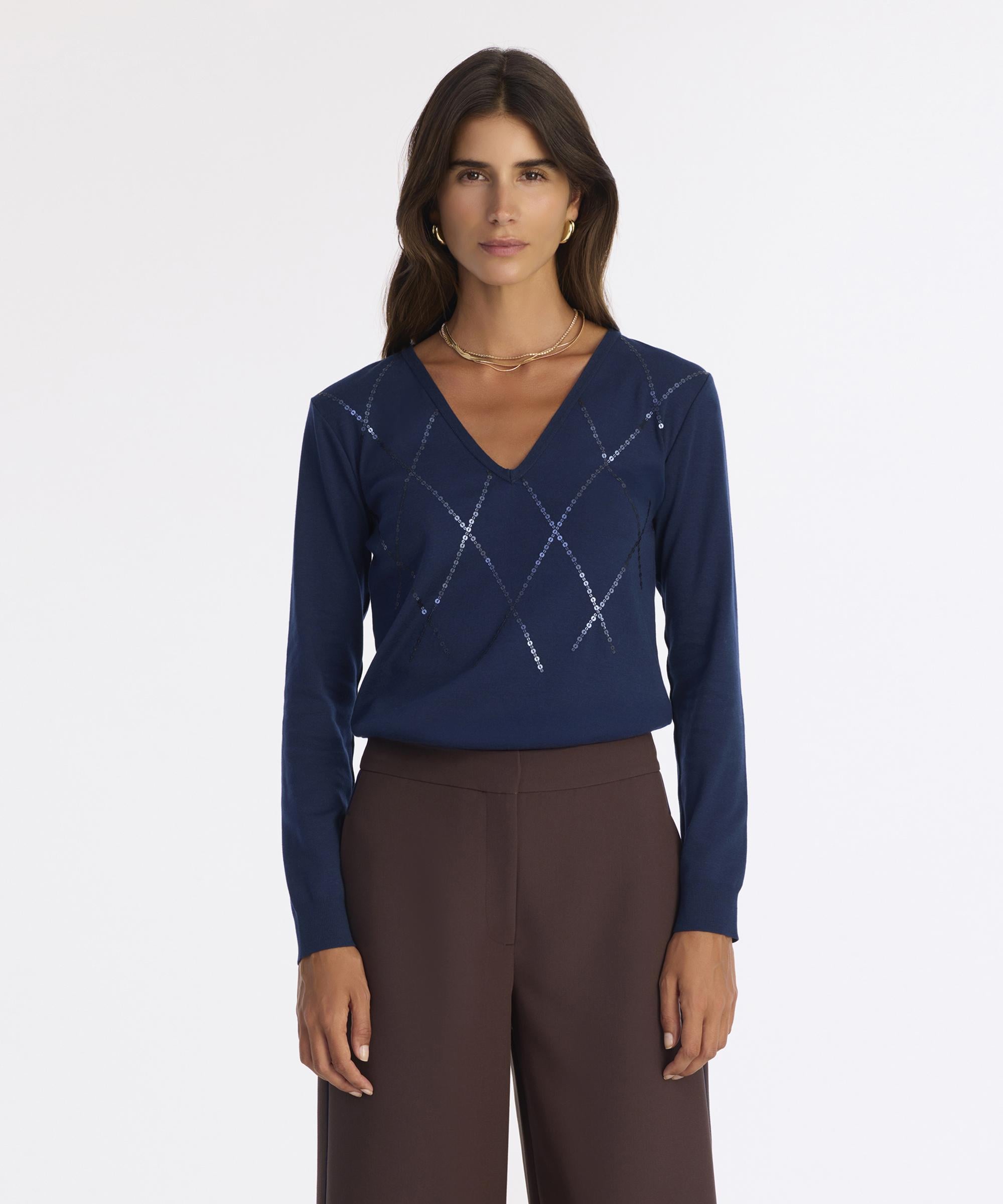 V yaka kesimi ve zarif pul detaylarıyla hareketlendirilmiş bu triko kazak, hem rahat hem de şık bir görünüm sunuyor. Ön yüzeyindeki geometrik desenler tasarıma derinlik kazandırırken, ince yapısıyla katmanlı kombinler için uygun bir zemin hazırlıyor. Kışlık kombinlerde yüksek bel kumaş pantolonlar ve şal yaka kabanlarla kolayca tamamlanabiliyor. Günlük kullanımda stilinizi sade ama dikkat çekici şekilde yansıtmanıza yardımcı olur.