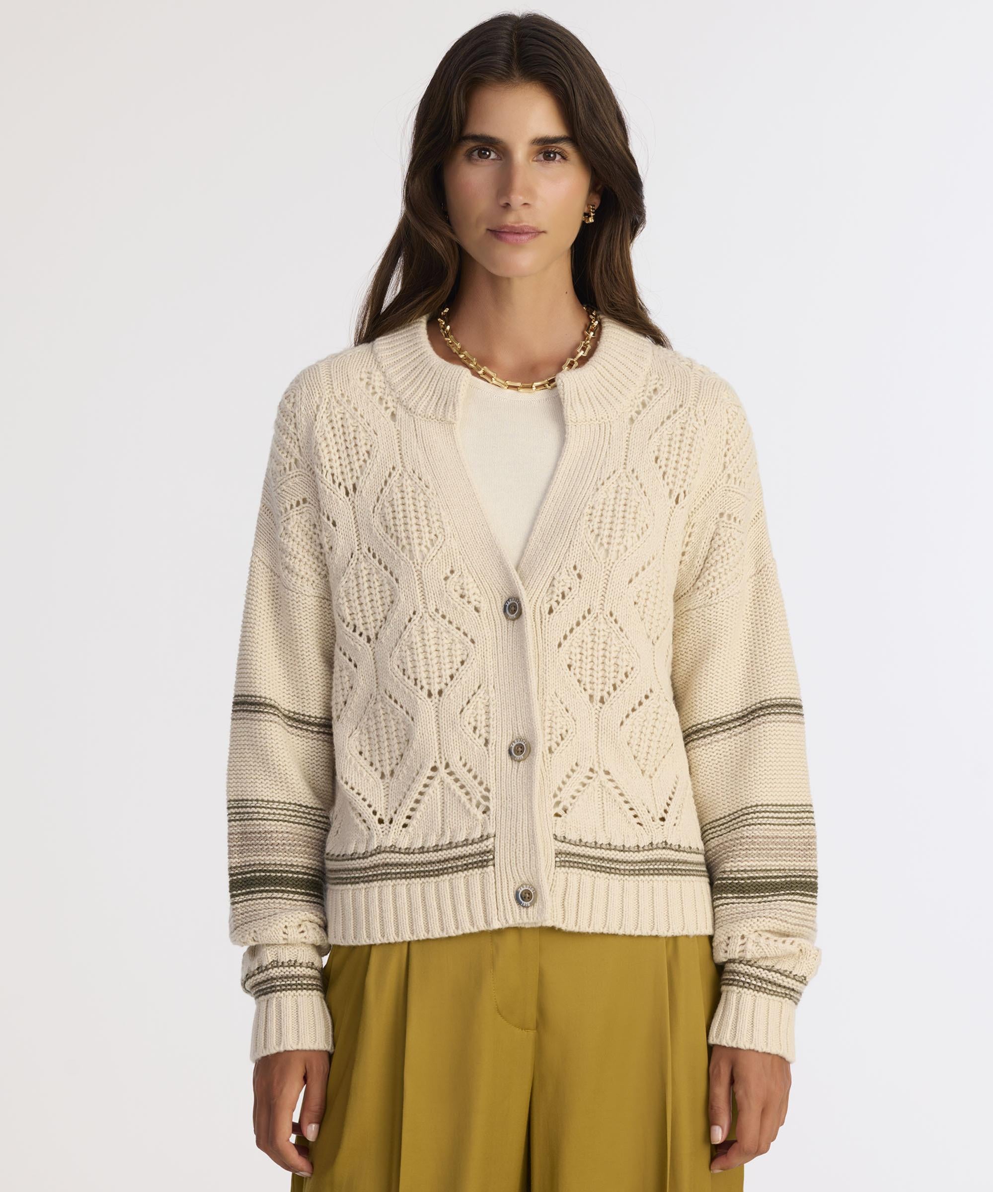 Örgü desenleriyle dikkat çeken bu triko hırka, nostaljik bir zarafet sunarken modern çizgilerle harmanlanıyor. Kol ve etek ucundaki çizgili detaylar ürüne hareket katarak şıklığı tamamlıyor. Serin kış günlerinde basic boğazlı kazaklarla ve kadife pantolonlarla harika bir uyum sağlıyor. Günlük kullanımda da rahatça tercih edilebilecek sıcak ve stil sahibi bir parça.