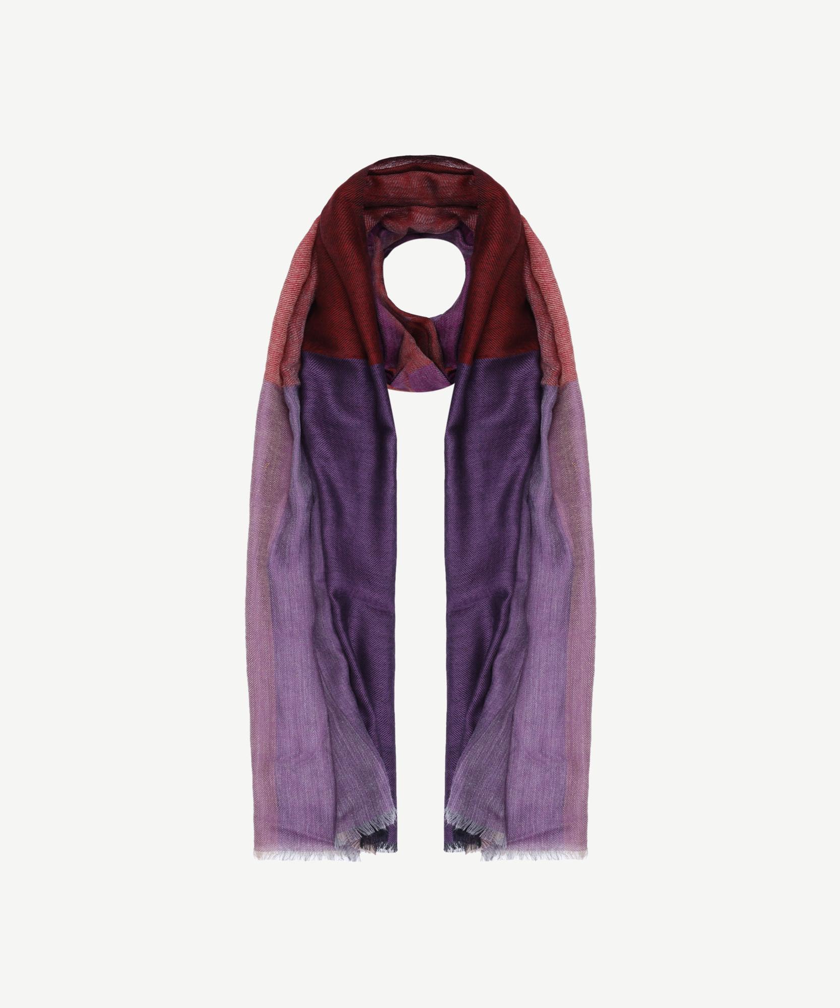Yumuşak geçişli renk bloklarıyla öne çıkan bu şal, mor ve bordo tonlarının dengeli uyumunu yansıtır. Günlük kombinlere zarif bir enerji katan bu parça, sade görünümlere modern bir dokunuş kazandırır.