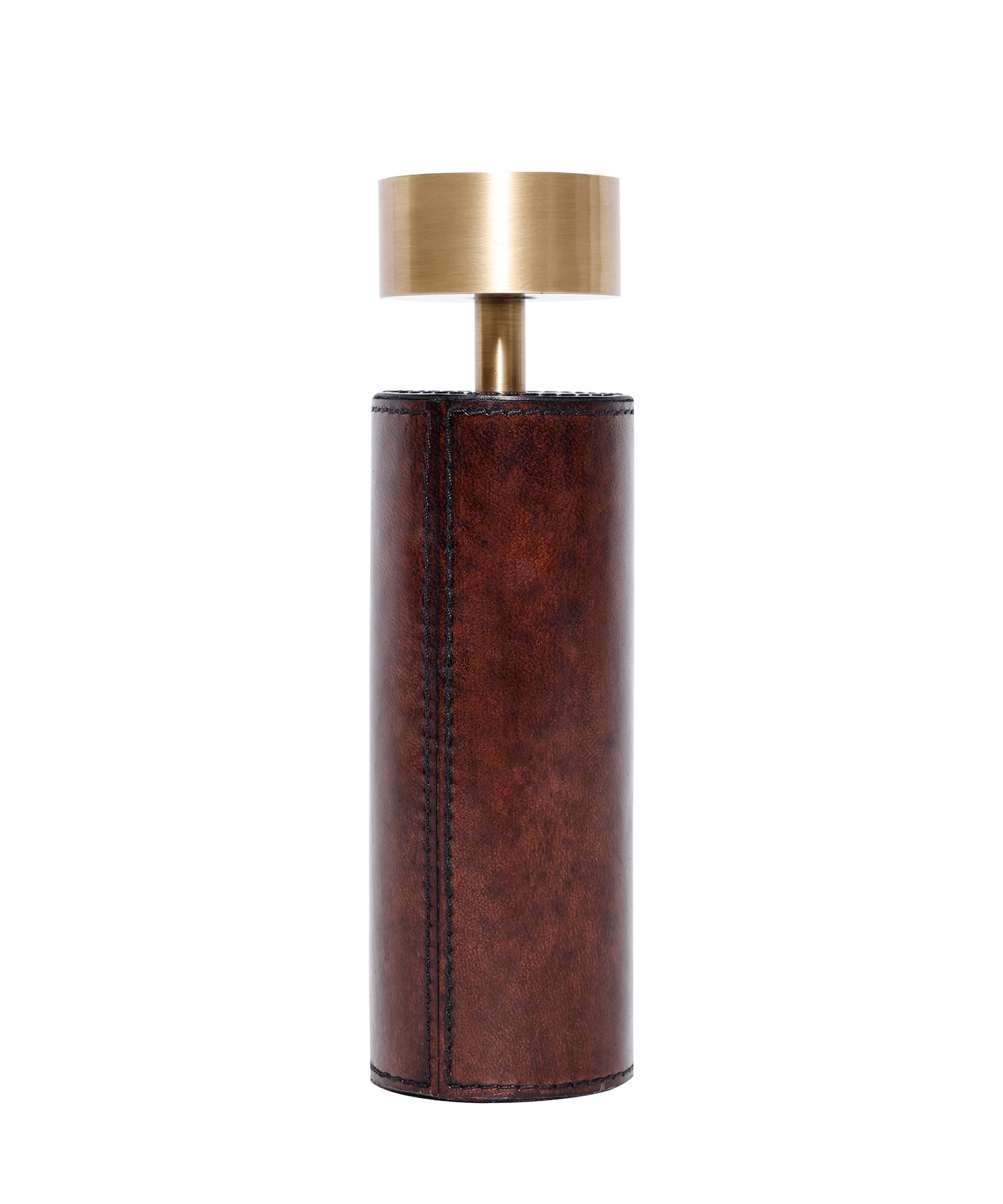 Zarif ve modern bir tasarıma sahip olan bu şamdan, silindirik formu ve sade hatlarıyla dikkat çeker. Üst kısmındaki metal detay, ürüne sofistike bir görünüm kazandırırken, tabanındaki doku şıklığı destekler. Hem klasik hem de çağdaş dekorasyonlarda kolaylıkla uyum sağlayan bu şamdan, yaşam alanlarına zarif bir atmosfer katmak için ideal bir tamamlayıcıdır.