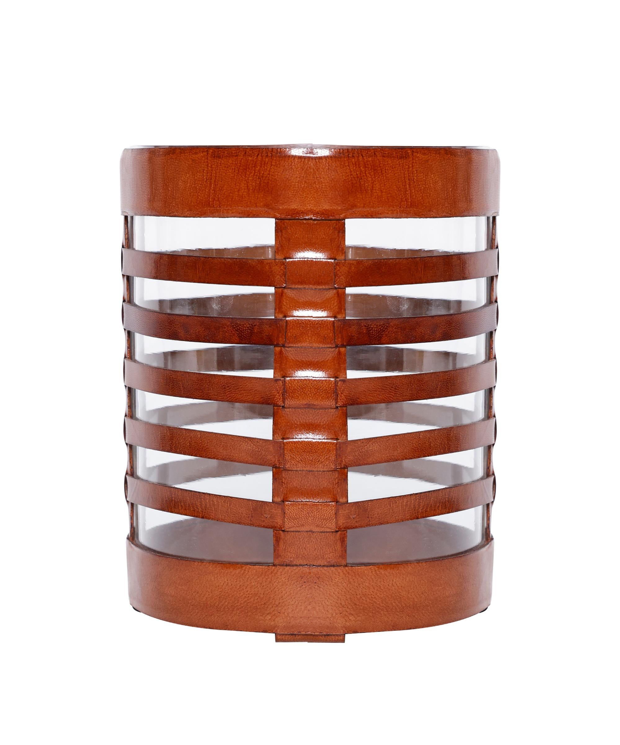 Bu zarif dekoratif obje, cam silindirin etrafını saran kahverengi deri şeritlerle dikkat çekiyor. Modern ve rustik detayları bir araya getiren tasarımıyla hem şamdan hem de vazo olarak kullanılabilir. Deri detayların kattığı sıcaklık, camın sade şıklığıyla dengelenerek yaşam alanlarına özgün bir karakter kazandırır. Tek başına bir aksesuar olarak veya içerisine mum, çiçek ya da kuru dal yerleştirerek farklı kullanım alternatifleri sunar. Doğal malzeme severler ve sofistike detaylara önem verenler için ideal bir parçadır.