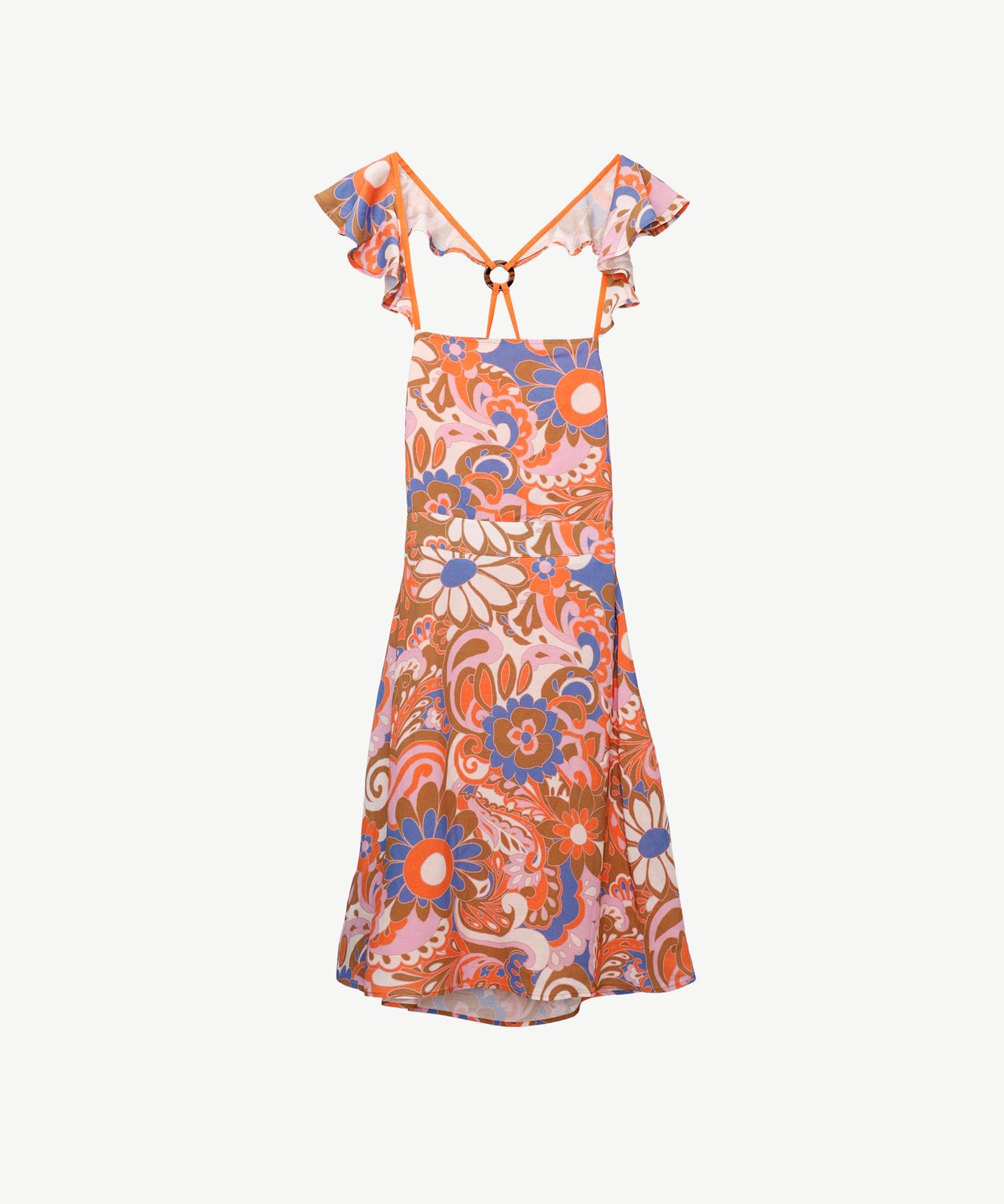 Viskon ve ketenden oluşan kumaşın yumuşak, parlak yapısı üzerindeki çiçek desenleriyle hareketlendiriliyor. Kol fırfırları ve sırttaki özgün detay sayesinde oluşan doğal ve romantik tarzı turuncu espadriller ve tek renk kumaş tote çanta ile tamamlayabilirsiniz.