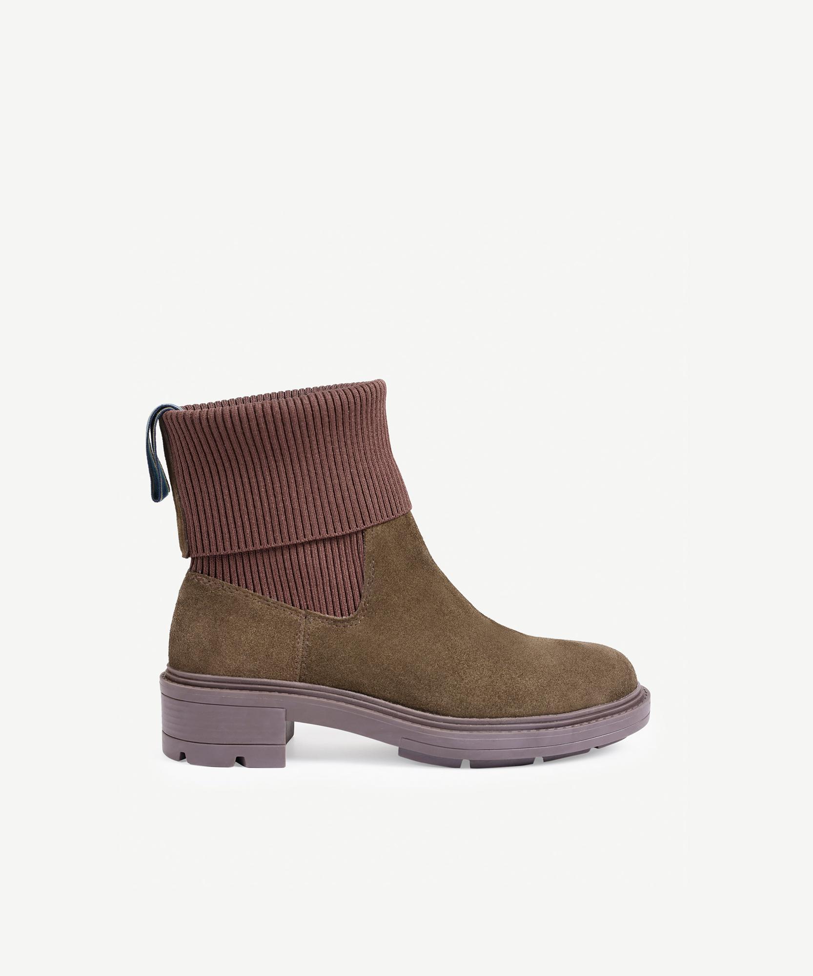 Kalın tabanlı süet bot yumuşak hatlı formu ve çoraplı boğaz tasarımı ile kombinlerinizin özgün stilini vurgulamak için ideal. Botları maksi fırfırlı eteklerle eşleştirerek bohem kombin yaratabilirsiniz.