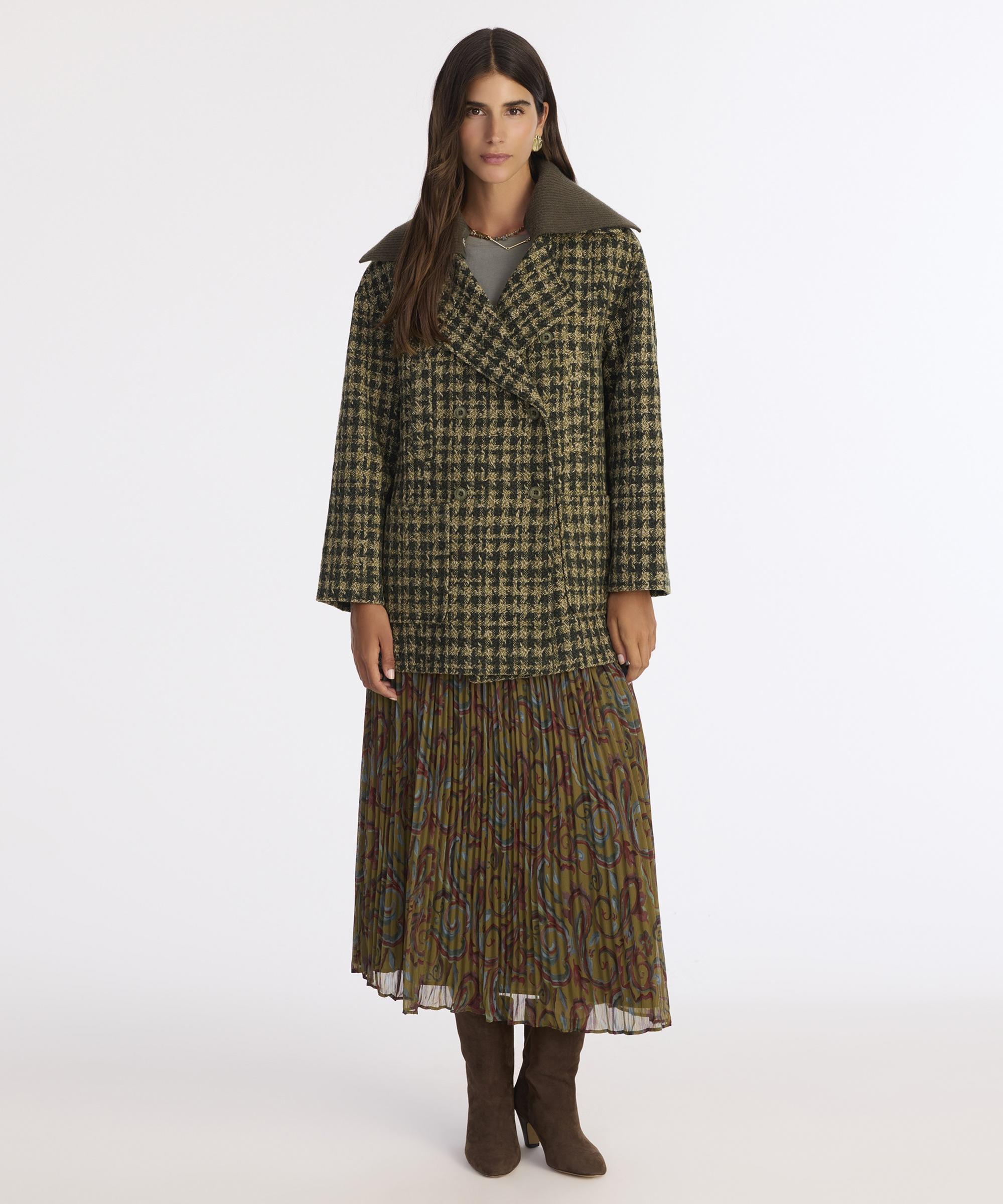 Ekose desenli yüzeyiyle klasik ve zamansız bir duruş sunan bu kaban, geniş yaka detayıyla şıklığına sofistike bir dokunuş katıyor. Çift düğmeli tasarımı ve kalın kumaşı sayesinde kış aylarında sıcak kalmanıza yardımcı olur. Günlük kullanımda rahatlıkla tercih edilebilirken, ofis kombinlerine de kolayca uyum sağlar. Diz üstü çizmeler ve boğazlı kazaklarla kombinlendiğinde stilinizi tamamlayan harika bir parça haline gelir.
