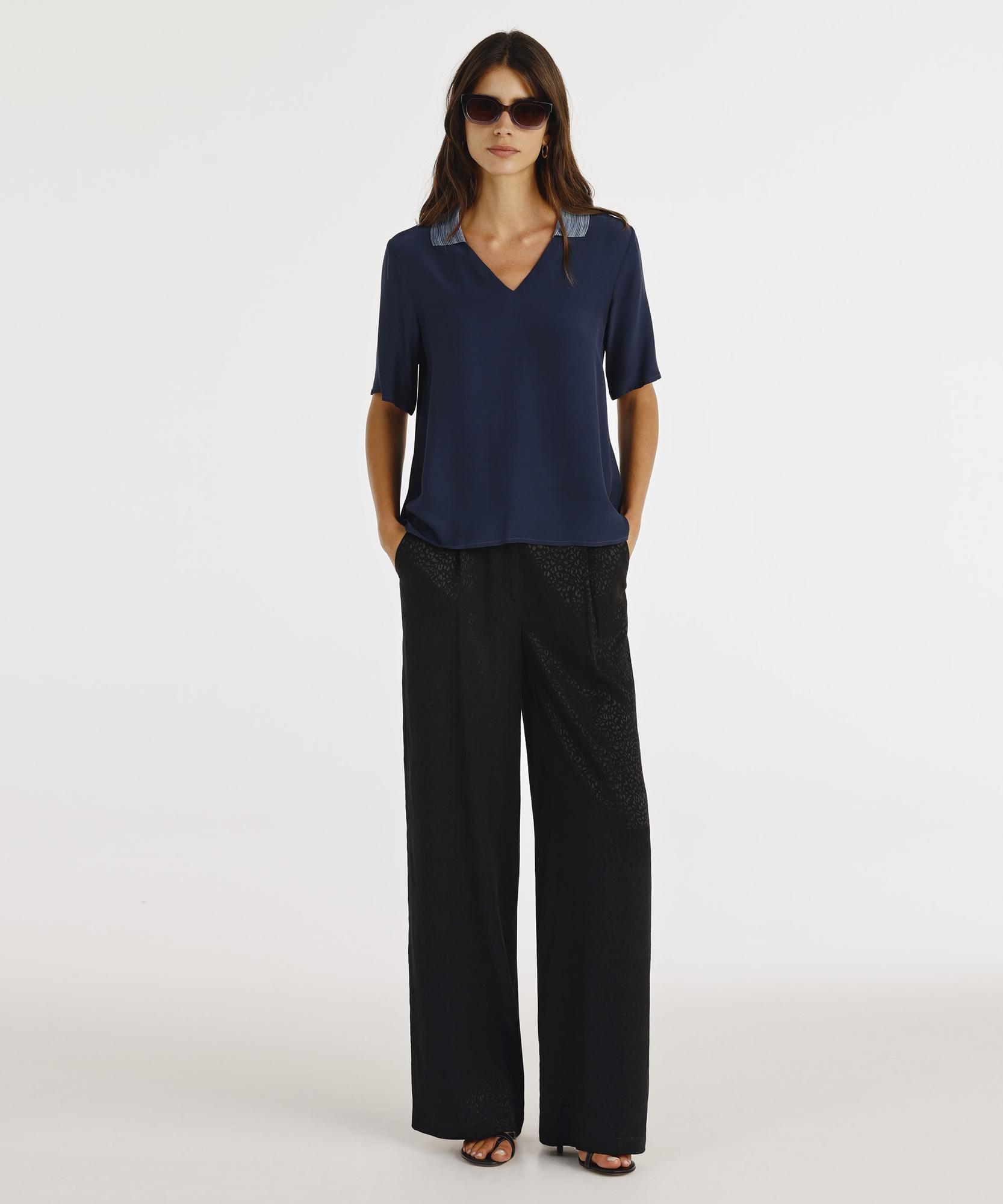 Şık ve modern tasarımıyla dikkat çeken bu bluz, zarif bir yakaya ve dökümlü kesime sahiptir. Günlük kombinlerde rahatlıkla kullanılabilir, klasik pantolonlarla veya jeanlerle tamamlanarak hem iş hem de şehir stiline uyum sağlar.