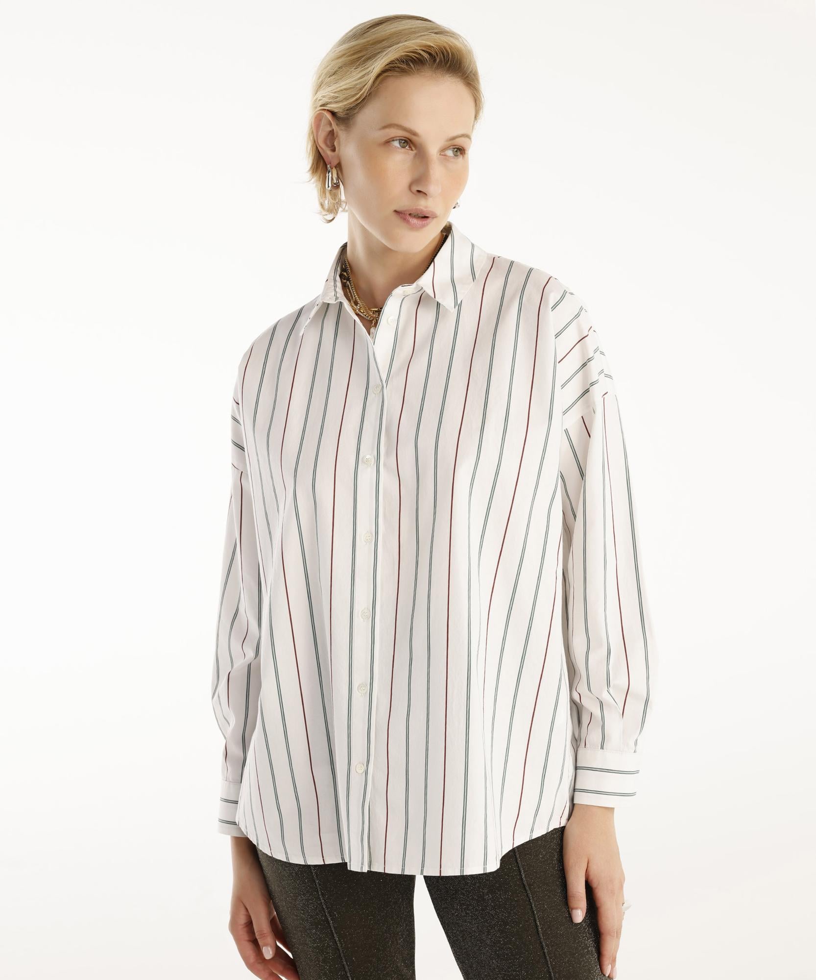 Beyaz zemin üzerine ince çizgili desenlerle süslenen bu bluz, rahat kesimi ve klasik yakası ile günlük kullanım için ideal. Hem şıklığı hem de konforu bir arada sunan bu bluz, farklı alt parçalarla kombinlenebilir.