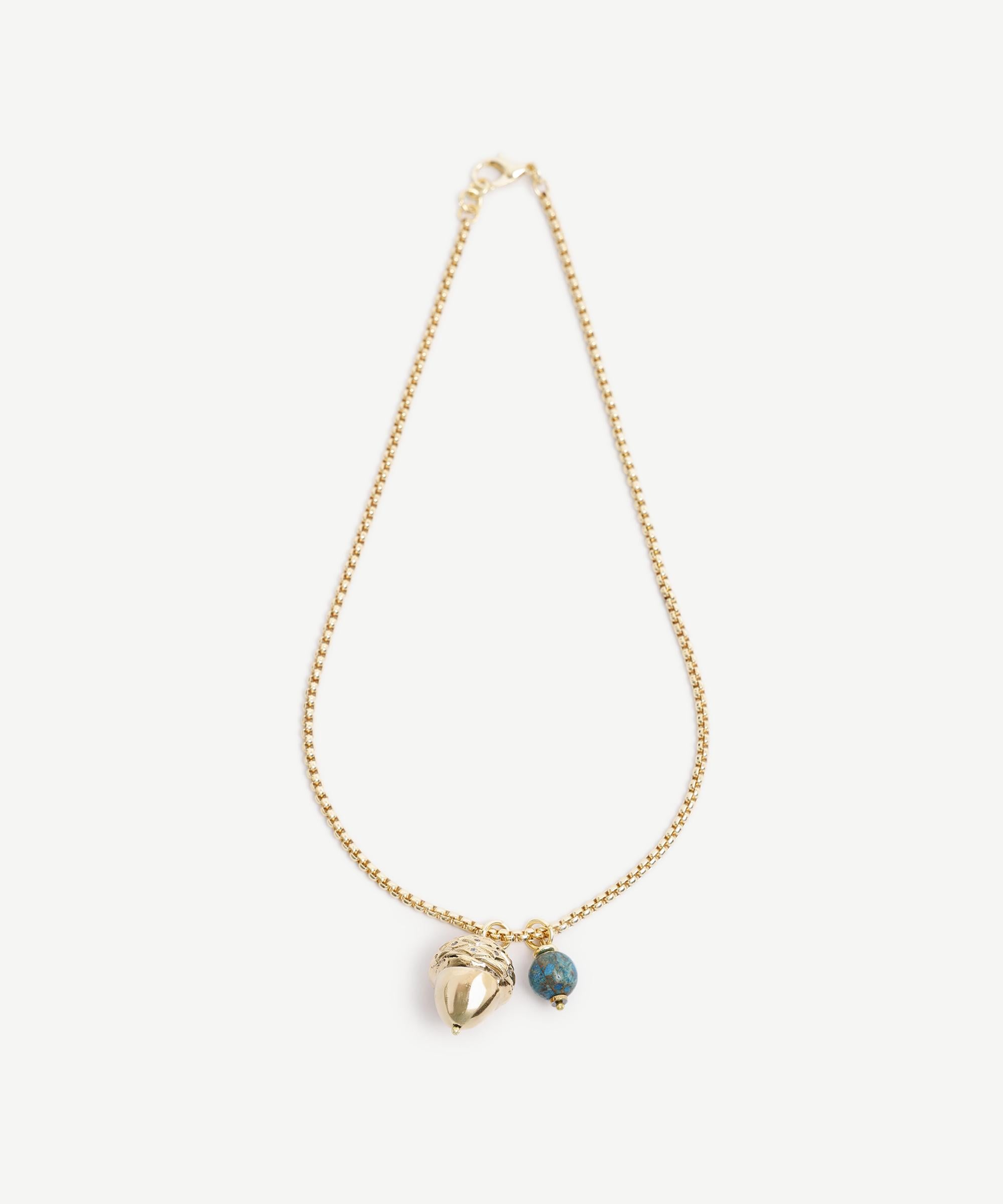 Doğadan ilham alan meşe palamudu formu ve zarif detaylarıyla öne çıkan bu kolye, sezonun romantik havasını stilinize taşır. Tek başına güçlü bir ifade sunarken, V yaka trikolar veya balıkçı yaka kazaklarla kolayca kombinlenebilir. Günlük stilinize sofistike bir dokunuş katar.