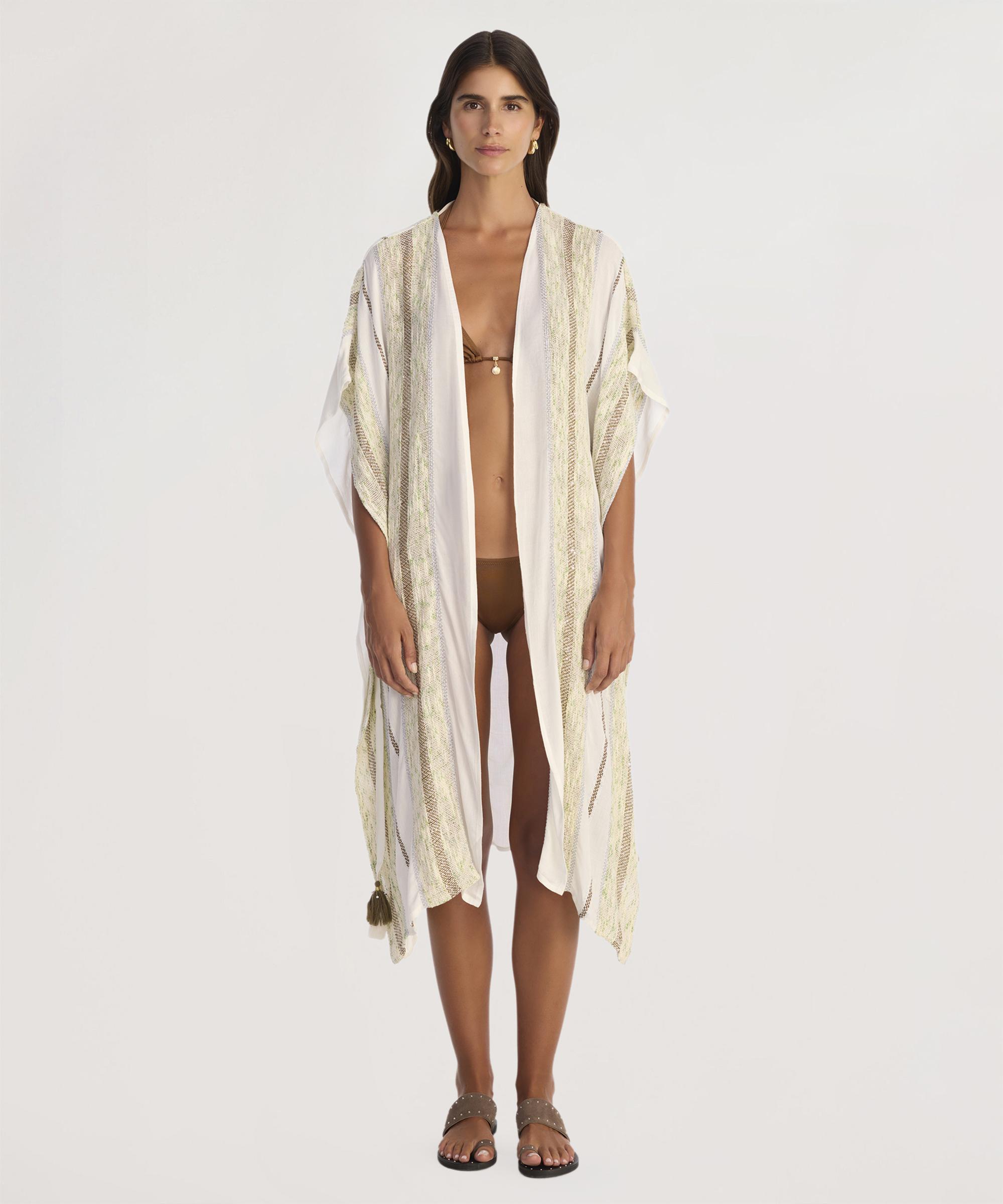 Hafif ve dökümlü kumaşıyla dikkat çeken bu kimonoya benzer elbise, rahat ve şık bir görünüm sunuyor. Geniş kesimi hareket özgürlüğü sağlarken, beldeki bağcık detayı vücuda uyum sağlar. Plajda mayo üzerine veya günlük kombinlerde rahat bir tamamlayıcı olarak kullanılabilir.