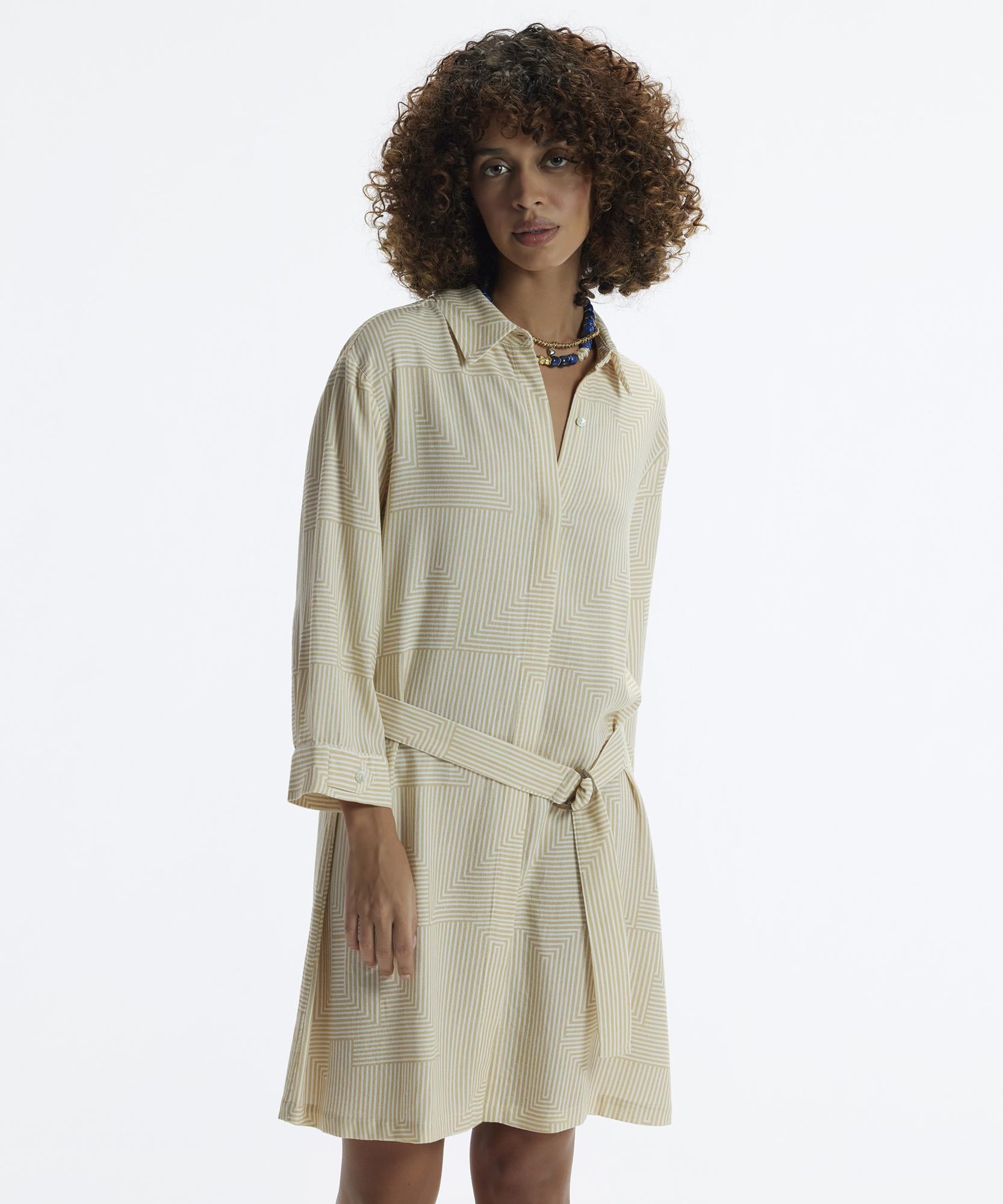 Zarif geometrik deseniyle bu elbise, modern bir görünüm vadediyor. Rahat kesimi ve zarif kuşak detayı, gün boyu şıklığı ve konforu garanti ederken klasik topuklular ve minimalist aksesuarlar ile kombinleyerek her ortamda elegan bir stil yaratabilirsiniz.