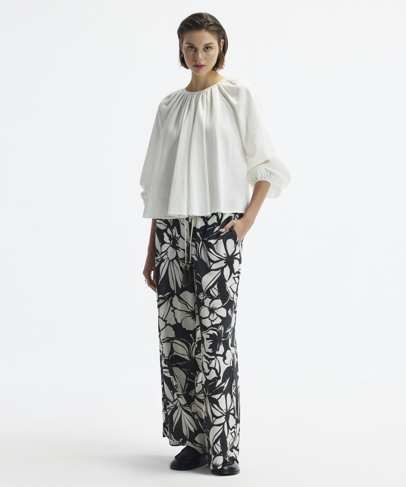 Özgün tasarımıyla bu bluz, gardıropların gözdesi olmaya aday. Yumuşak dokusu ve geniş kollu yapısı ile hem konforlu hem de trend bir görünüm sağlarken kot pantolonlarla günlük, eteklerle ise daha resmi bir tarz yakalayabilirsiniz.