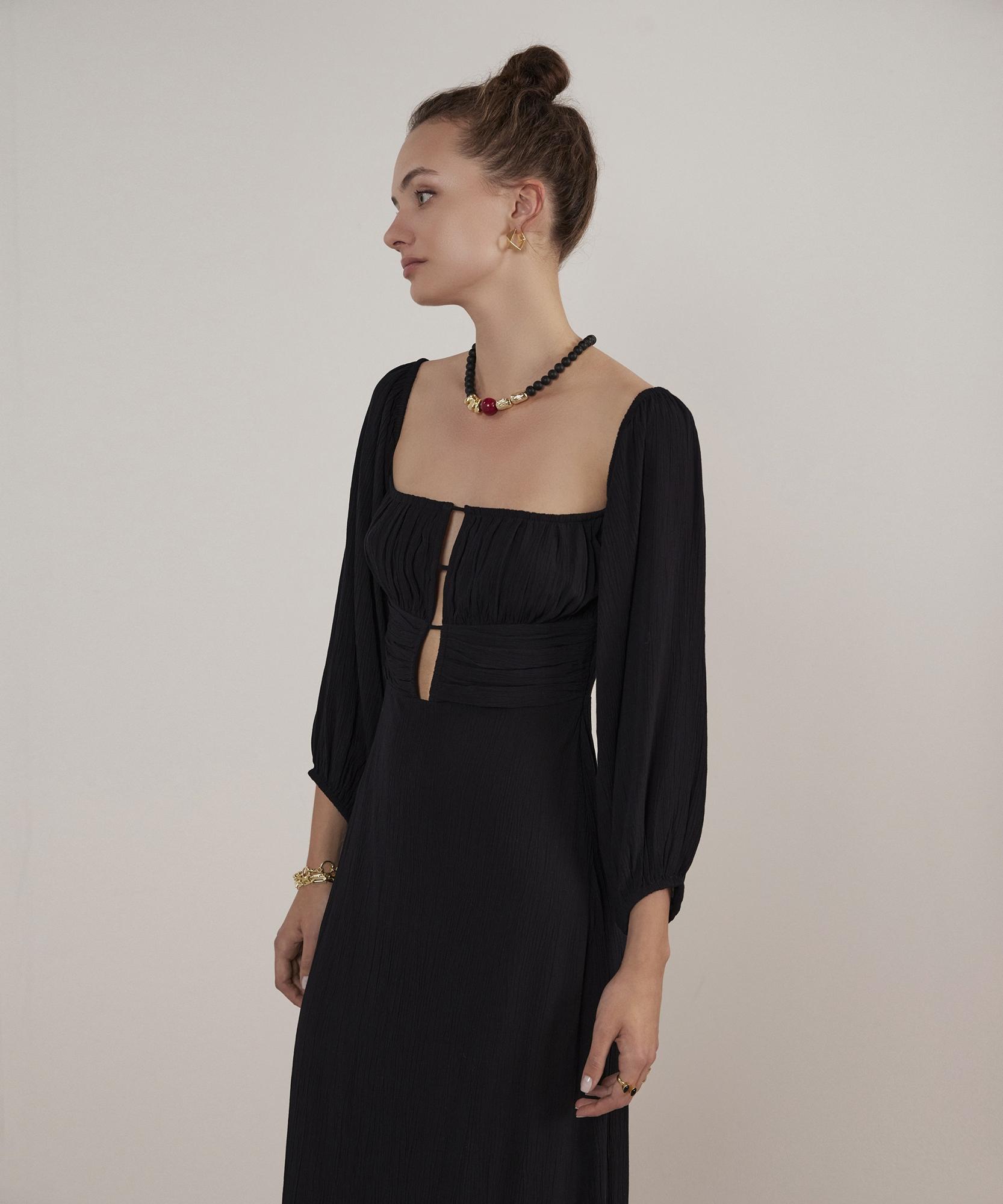 Uzun kollu viskon elbise yumuşak dokunuşlarıyla konforlu, pencere detayıyla da feminen stili öne çıkarıyor. Sofistike elbiseyi yarım bot ve kot montla eşleştirerek romantik bir tarz yaratabilirsiniz.