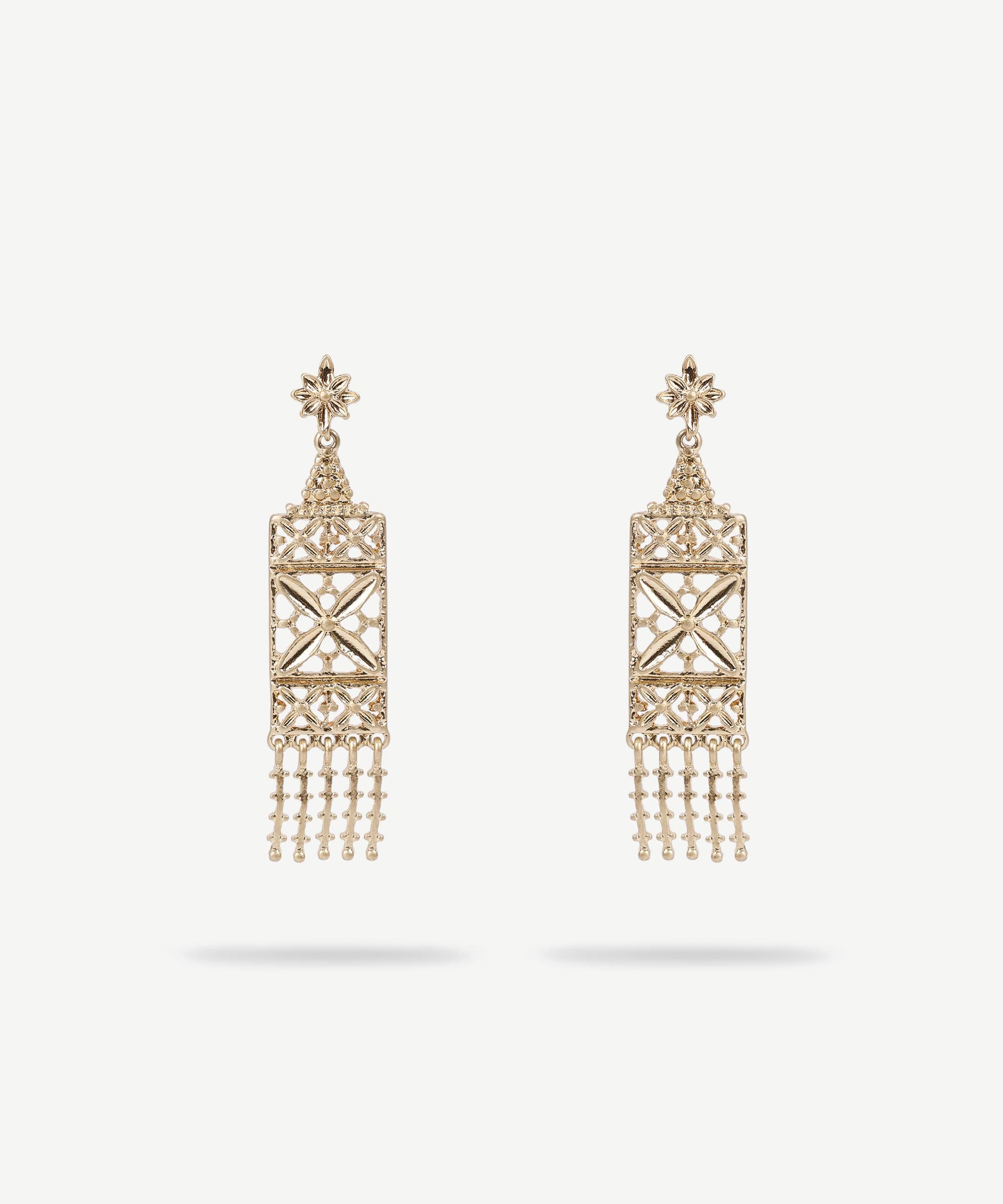 Etnik detaylarla zenginleşen bu sallantılı küpe, zarif formuyla nostaljik bir şıklık sunar. Özgün dokusu ve dikkat çekici tasarımı sayesinde sade kombinlere sofistike bir hava katar. Özellikle bohem elbiseler, balıkçı yaka trikolar ya da oversized gömleklerle güçlü bir uyum sağlar.