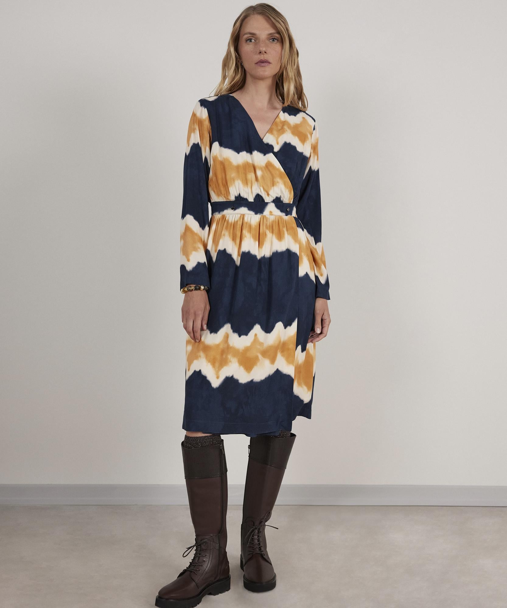 V yaka elbise envelop formu ile bel detayını öne çıkartırken sürdürülebilir viskon kumaşı ile de çevreye olan hassasiyetinizi yansıtıyor. Elbiseyi ton sür ton aksesuar ve paltolarla eşleştirebilirsiniz.