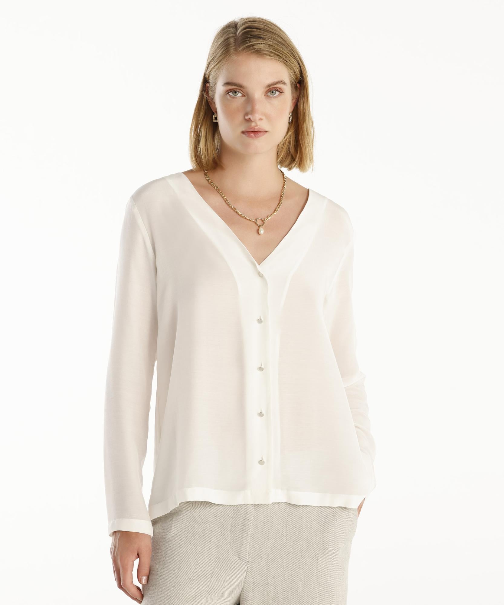 Bu bluz, sade ve şık tasarımı ile dikkat çekiyor. V yaka ve düğmeli ön kısmı ile zarif bir stil sunan bu model, çeşitli kombinler için ideal ve hem gündüz hem de gece şıklığına uyum sağlayabilir.