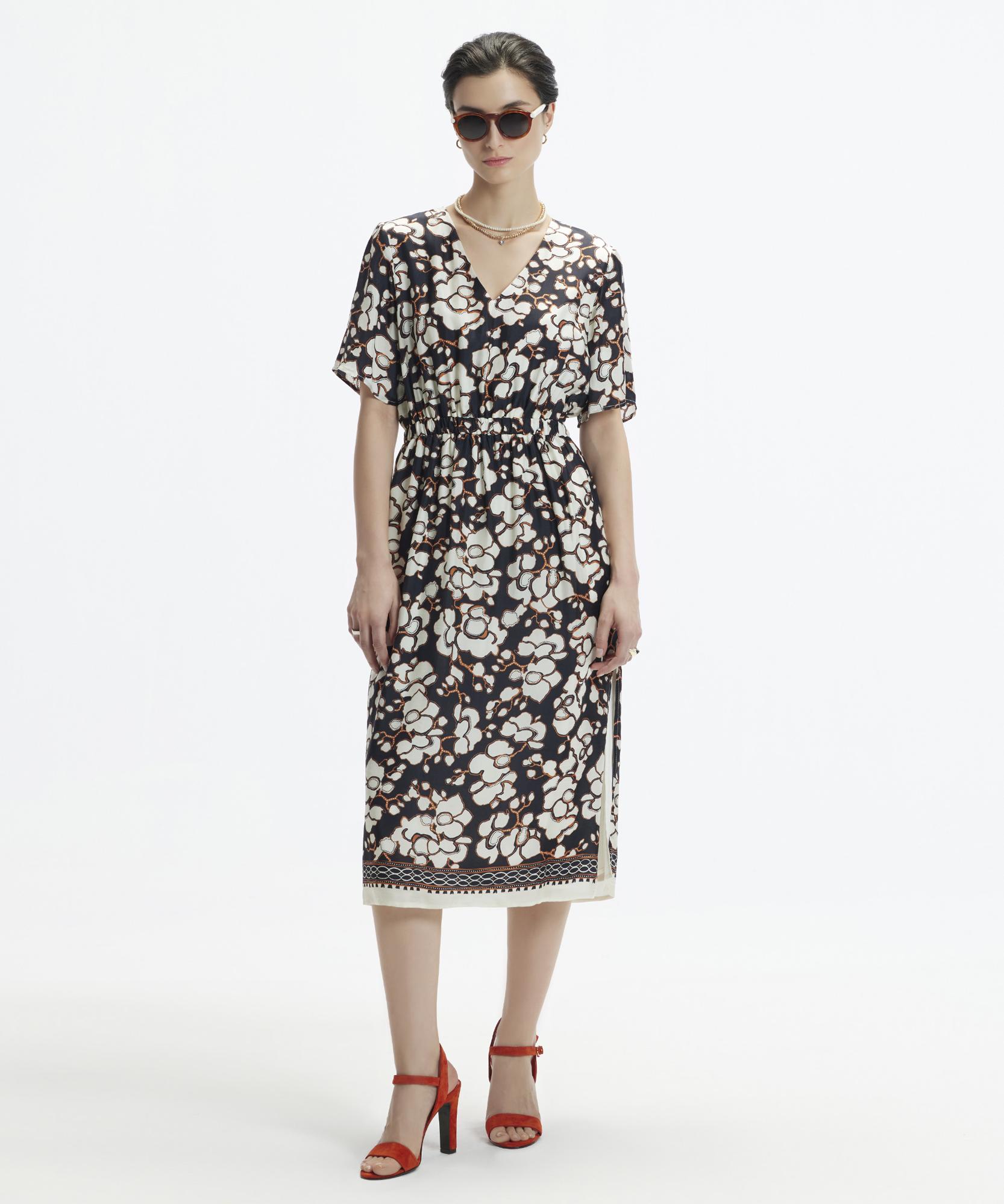 Desenleri ve V yaka kesimi ile bu elbise, herhangi bir mevsimde şık bir seçim olmaya aday. Elastik beli ile rahat bir oturuş sunarken, kumaşın dokusu gün boyu konfor sağlar. Bu parçayı düz renk bir ceket ve sneaker ile kombinleyerek şık bir ilkbahar görünümü elde edebilirsiniz.