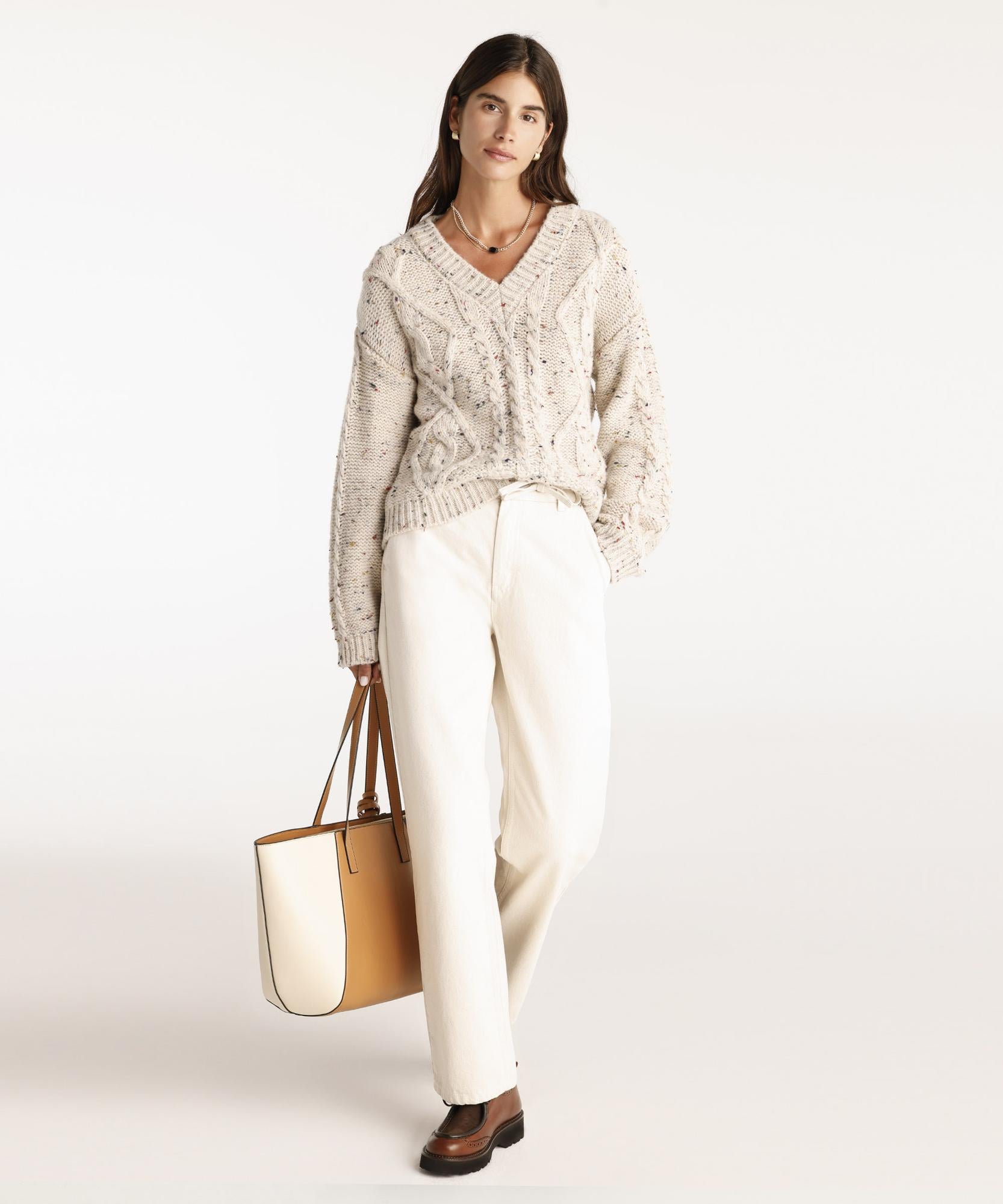 Bu örgü kazak, kalın dokusuyla soğuk günlerde sıcak tutarken, modern bir stil sunar. Geniş V yakası ve rahat kesimi sayesinde, hem kot pantolonlarla hem de bol paça pantolonlarla kombinlenebilir. Kazak, günlük şıklık için mükemmel bir parça olup, büyük takılar ve şık bir çanta ile tamamlanabilir.