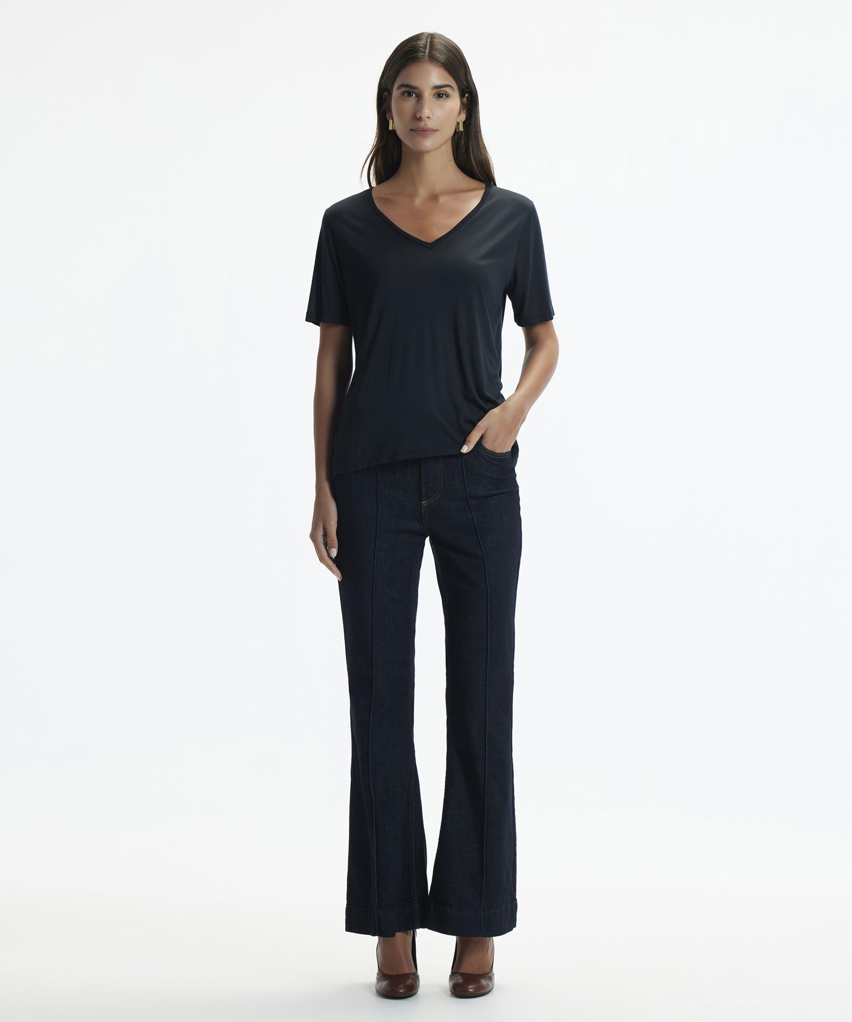 Modal kumaştan üretilen t-shirt klasik V yakalı stilden hoşlanan kadınlar için tasarlandı. Çabasız şıklığı lüks estetikle birleştirmek için bu parçayı tercih edebilirsiniz.