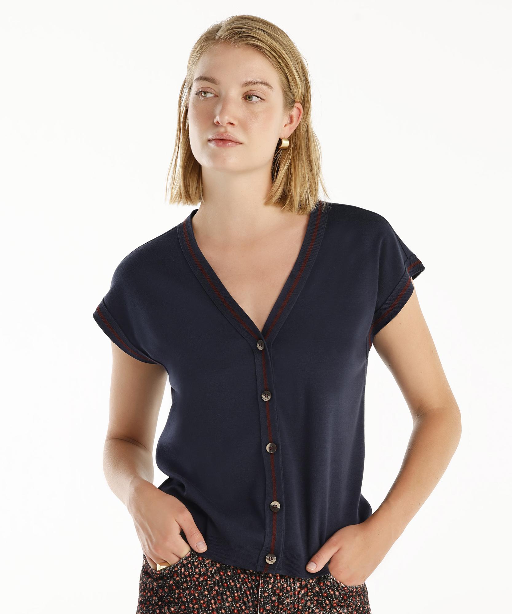 Modern ve şık tasarımıyla bu kısa kollu triko, hem rahat hem de şık olmanızı sağlar. Etek ya da pantolonlarla kombinleyerek farklı tarzlar yaratabilirsiniz.