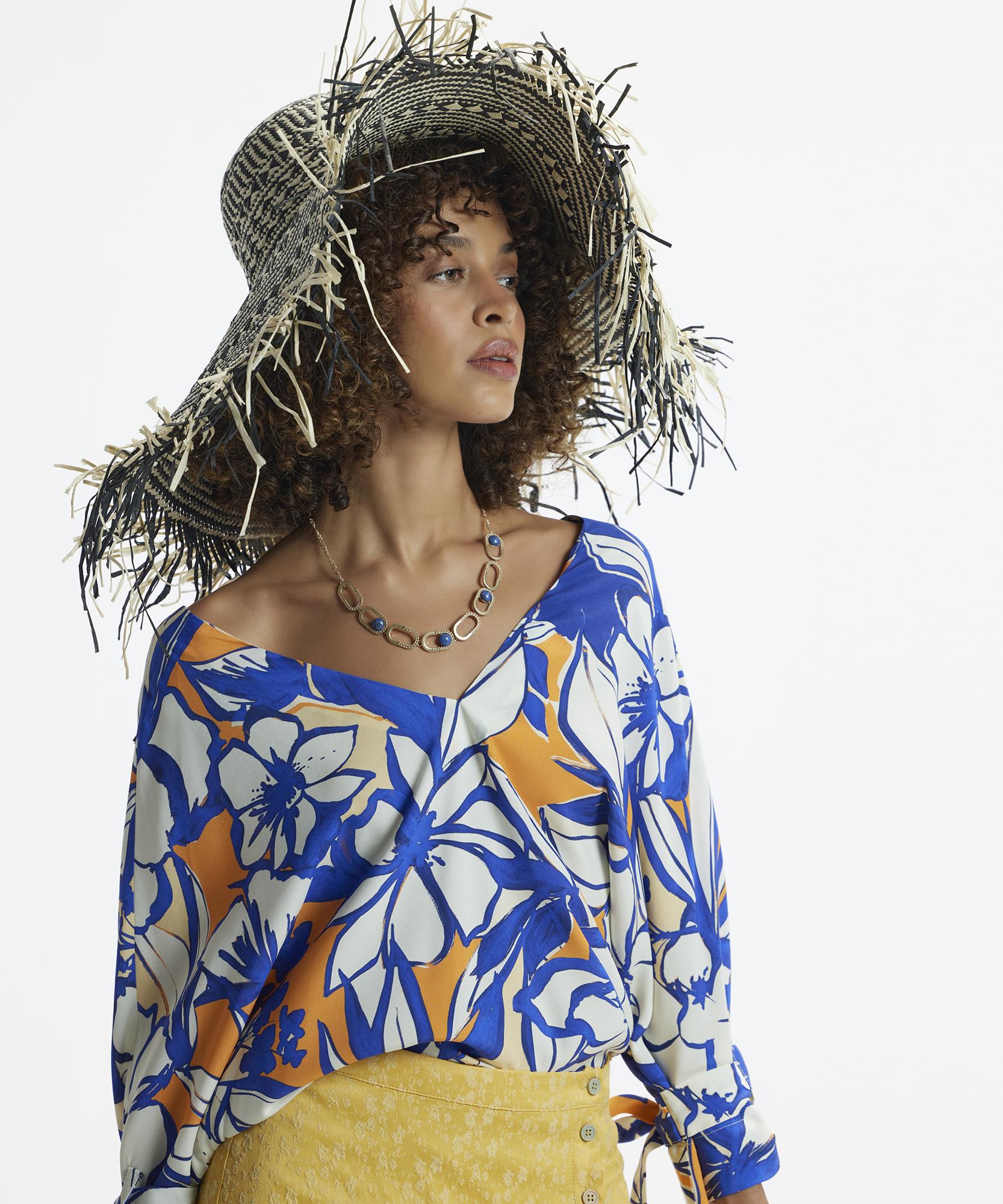 Canlı desenleriyle göz alıcı bu bluz, tarzınızda bahar ve yaz aylarının ruhunu yansıtıyor. Geniş kesimi ve rahat kolları ile gün boyu konfor sunarken, düz renkli dar paça pantolonlar veya şortlarla tamamlandığında ideal bir hafta sonu kombini oluşturur.