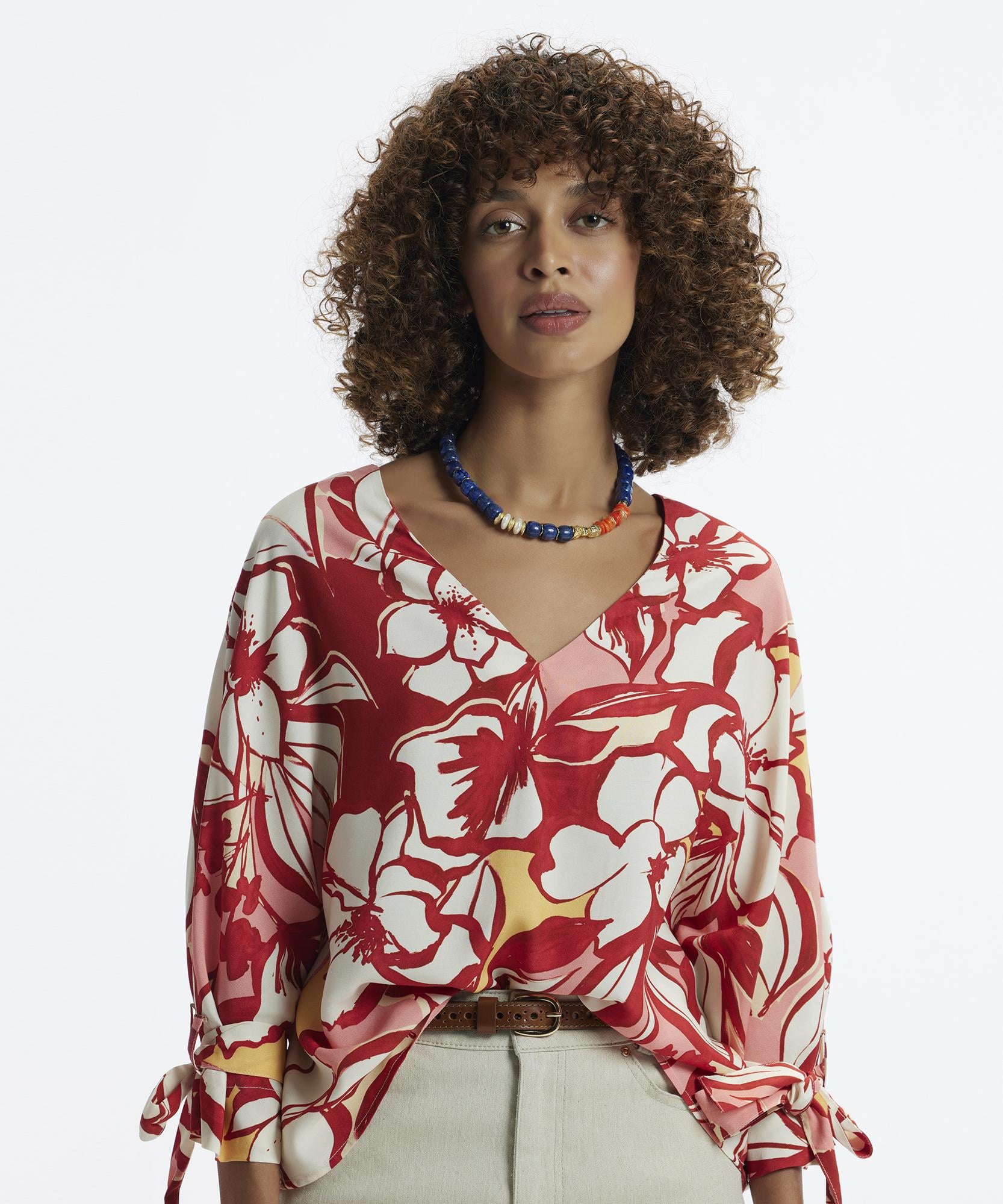 Canlı desenleriyle göz alıcı bu bluz, tarzınızda bahar ve yaz aylarının ruhunu yansıtıyor. Geniş kesimi ve rahat kolları ile gün boyu konfor sunarken, düz renkli dar paça pantolonlar veya şortlarla tamamlandığında ideal bir hafta sonu kombini oluşturur.