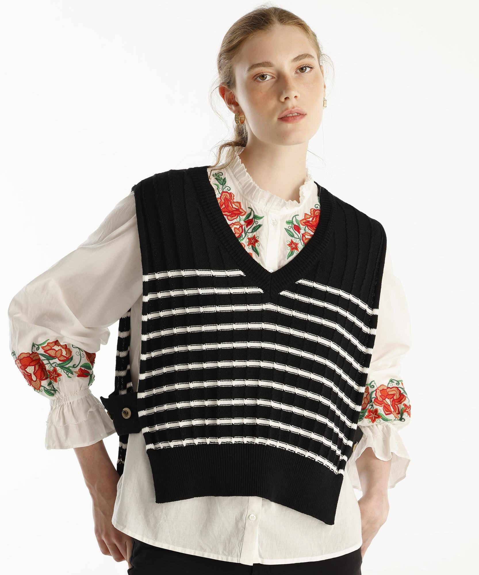 Yumuşak dokusu ve zarif tasarımı ile bu yelek, çizgi detaylarıyla öne çıkıyor. Renkli detayları sayesinde modern bir görünüm sağlar. Etek ve çizmelerle kombinleyerek zarif bir stil yaratabilirsiniz.