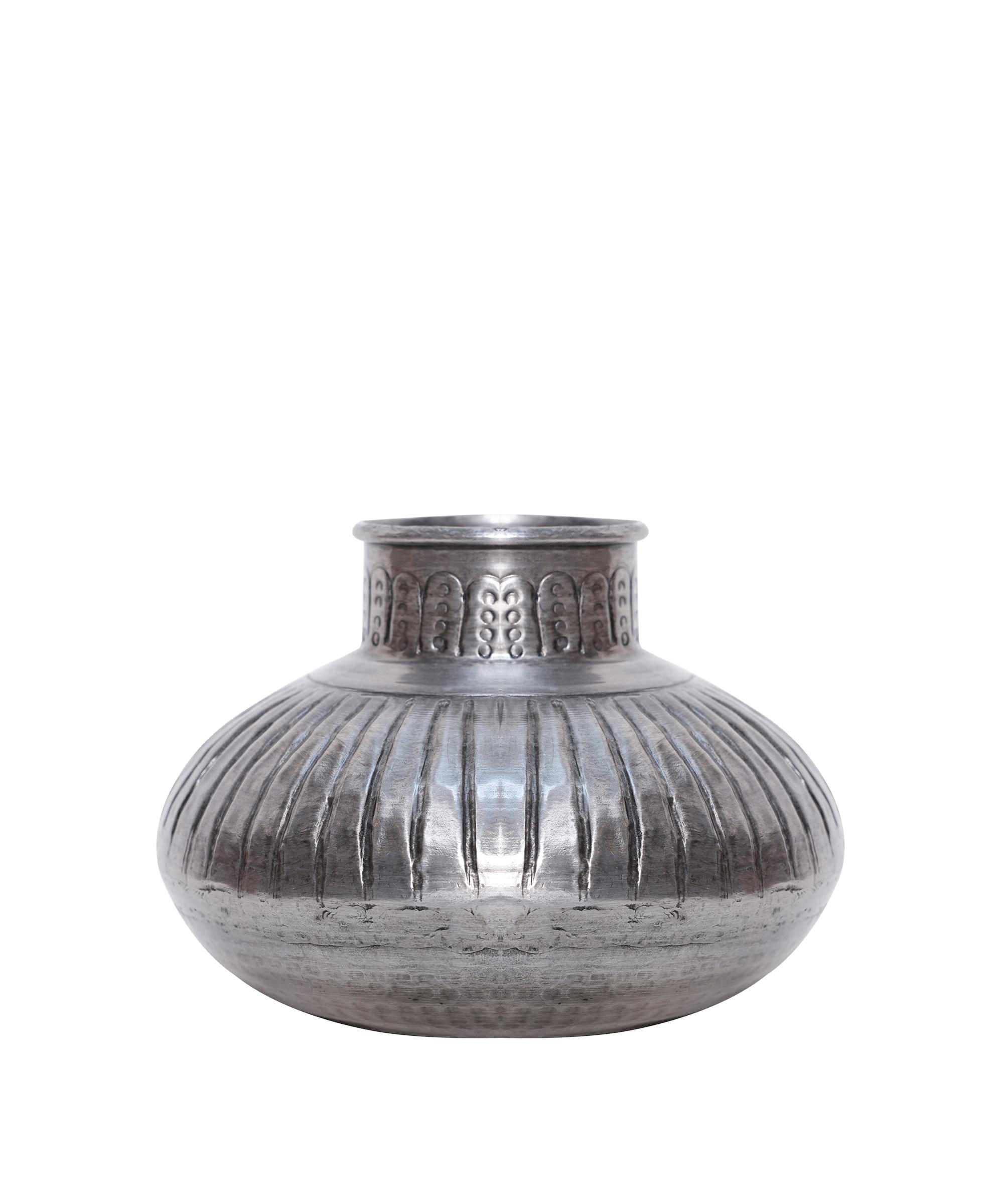 Geleneksel formlardan ilham alan bu metal vazo, el işçiliğini yansıtan kabartma desenleri ve mat gümüş tonuyla zamansız bir şıklık sunar. Dolgun formu sayesinde tek başına dekoratif bir obje olarak da öne çıkan bu parça, özellikle kış sezonu dekorasyonlarına güçlü ve karakterli bir dokunuş katar.