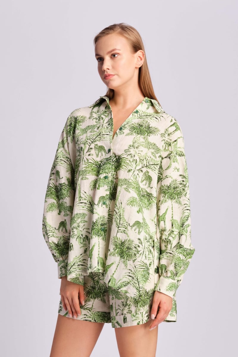 Gömlek yaka, yanları yırtmaç detaylı, dijital baskılı keten gömlek.%69 Cotton %31 LinenBu ürünü 30 derecede, benzer renklerle, tersten yıkayınız ve gölgede kurutunuz. Baskı veya nakış olan bölgeye ütü temas ettirmeyiniz, bu bölge tersten ütülenebilir.