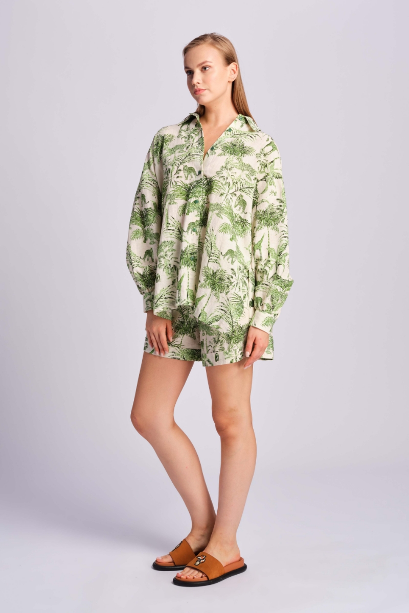 Dijital baskılı keten bermuda şort.%69 Cotton %31 LinenBu ürünü 30 derecede, benzer renklerle, tersten yıkayınız ve gölgede kurutunuz. Baskı veya nakış olan bölgeye ütü temas ettirmeyiniz, bu bölge tersten ütülenebilir.