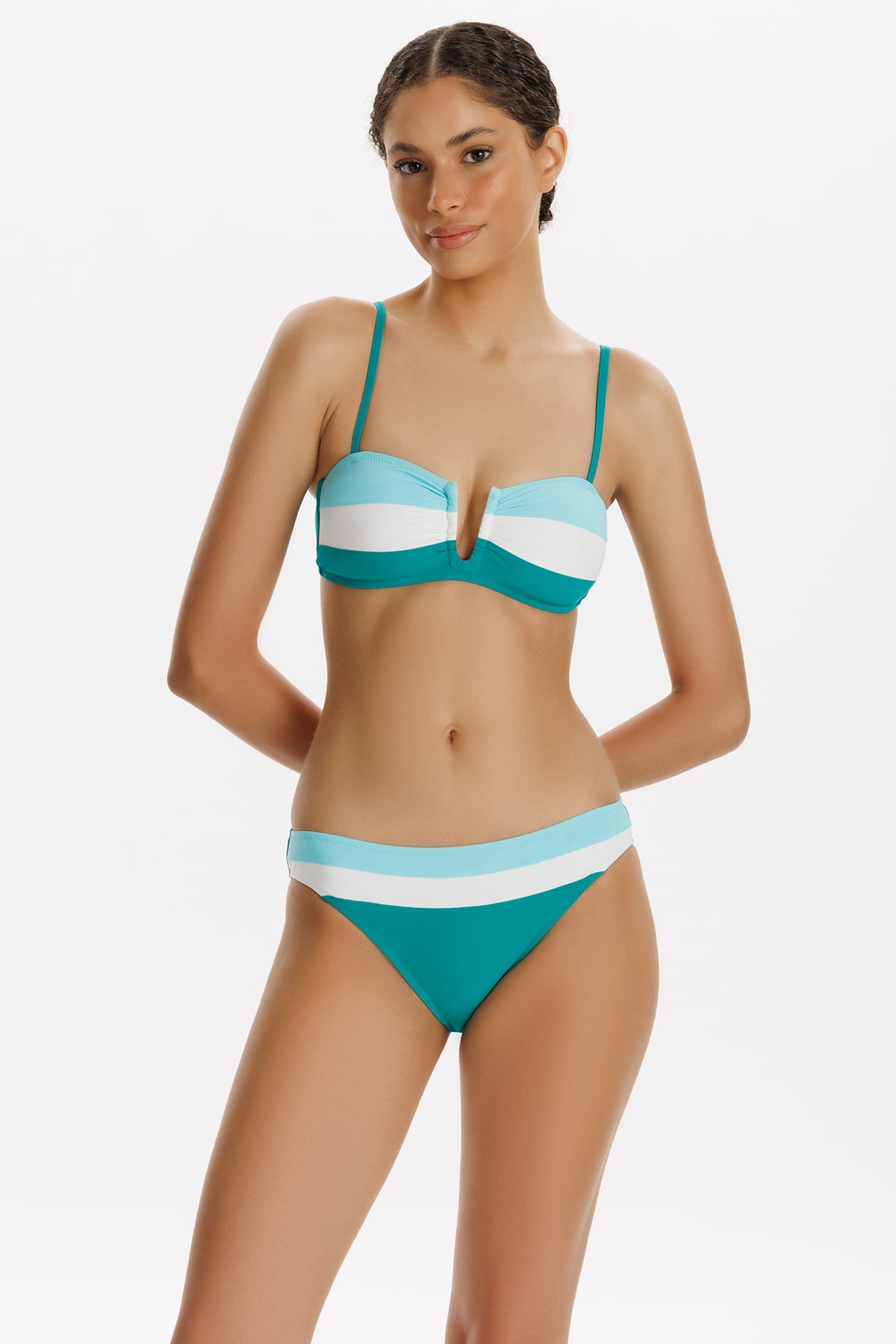 MARİS - U TEL BİKİNİ Ürün Özellikleri: • Tasarım: Şık ve sportif stili bir araya getiren straplez bikini takımı, omuzlarını vurgulamak isteyen ve bronzlaşırken askı izi oluşmasını istemeyen kadınlar için idealdir. Takıp çıkarılabilen kapları ve sabit ayarlanabilir askıları ile göğsü şekillendirip doğal bir görünüm sağlar. Biyeli kontrast alt parça düz klasik kesimiyle vücut formuna fit bir görünüm sunar. • Askı Detayı: İnce sabit ayarlanabilir askı özelliği, kullanım kolaylığı ve konfor sunar. • Göğüs: Balensiz ve dolgusuz doğal formu ön planda tutan, isteğe bağlı çıkarılabilir kaplarla zenginleştirilmiştir. • Bikini Alt: Standart kesim yan kenarları rahat ve klasik bir seçenek sunuyor. • Kumaş: %75 PA - %25 EA içeriği, yüksek hareket özgürlüğü ve uzun ömürlü kullanım sunar. • Astar: Tamamen astarlı yapısı sayesinde konfor ve uzun süreli kullanım imkanı sunar. • Aksesuar: Gümüş kopça detayı ile zarif bir görünüm sunuyor.